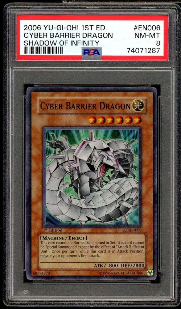 About us Contact Us Payment Shipping HAVE A QUESTION? - Click to find out more Feedback Add to Favorite Seller Join Mailing List CATEGORIES Home Graded Cards Baseball Graded Basketball Graded Football Graded Hockey Graded Golf Graded Other Sports Graded Non-Sports Graded Single Cards Baseball Cards Basketball Cards Football Cards Hockey Cards Other Cards Boxes/Packs/Sets Sealed Boxes/Packs Factory Sets Hand Collated Sets Magazines & Newspapers Sports Illustrated Beckett Price Guides The Sporting News Dallas Cowboy Weekly Newspaper Other Magazines and Newspapers Memorabilia Autographed Memorabilia Other Memorabilia 99.9% Positive FEEDBACK FREE SHIPPING ON CARDS AND BOXES Product information Cyber Barrier Dragon Shadow Of Infinity 2006 Yu-Gi-Oh 1st Edition #eno06 PSA 8 Click on the Image to Enlarge Specifications: PLEASE NOTE YOU WILL GET THE EXACT ITEM PICTURED IN THE LISTING. PLEASE DO NOT HESITATE TO ASK ANY QUESTIONS BEFORE BUYING. Description All our graded card holders are in mint condition and crack free unless noted otherwise. If you are not familiar with PSA (Professional Sports Authenticator), BGS/BCCG (Beckett Grading Services or Beckett Collector Club Grading) or ISA (International Sports Authentication) all cards can be looked up on the company websites for verification. Payment We accept all major credit, debit, and bank payments through PayPal. Please make payment in a timely fashion after purchase. Shipping All orders placed before 11 AM Central Time Monday - Friday are picked and shipped the same day. we offer free Shipping on all items except for media. Magazines, Newspapers, and Price Guides have a $4.95 shipping & handling fee. About us Your #1 source for graded sports cards! Established as a fulltime sports cards company in 1995 we carry one of the largest graded card inventories in the country with the widest variety of BGS, BCCG, ISA and PSA graded sports cards. We are adding inventory to our Store daily so come back often to check out our new acquisitions. If there is a card you are looking for that we don\'t have in our inventory, send us a message and we find it for you. Unlike other sellers we own our inventory, no consignments and no auctions, so we take pride in every sale. We make sure that every card we sell is the highest quality item possible before it leaves our hands and packaged safely and securely. We have consistently had over $1 million plus in sales and handled cards from a 1952 Topps Mickey Mantle to a 1985 Star Michael Jordan. so if your looking for a company with the best sports knowledge and great customer service, Superior Sports Investments has you coverd We accept all major credit, debit, and bank payments through PayPal. Please make payment in a timely fashion after purchase. All orders placed before 11 AM Central Time Monday - Friday are picked and shipped the same day. We offer free First Shipping on all items except for media. Magazines, Newspapers, and Price Guides have a $4.95 shipping & handling fee. Your #1 source for graded sports cards! Established as a fulltime sports cards company in 1995 we carry one of the largest graded card inventories in the country with the widest variety of BGS, BCCG, ISA and PSA graded sports cards. We are adding inventory to our Store daily so come back often to check out our new acquisitions. If there is a card you are looking for that we don\'t have in our inventory, send us a message and we find it for you. Unlike other sellers we own our inventory, no consignments and no auctions, so we take pride in every sale. We make sure that every card we sell is the highest quality item possible before it leaves our hands and packaged safely and securely. We have consistently had over $2 million plus in sales and handled cards from a 1952 Topps Mickey Mantle to a 1985 Star Michael Jordan. so if your looking for a company with the best sports knowledge and great customer service, Superior Sports Investments has you covered Join Our Exclusive Newsletter For Up To Date News, Special Offers And New Arrivals Sign up Now Shop Categories Graded Cards Single Cards Boxes/Packs/Sets Magazines & Newspapers Memorabilia Quick Links Feedback Add to Favorite Seller Shop info Home About us Shipping Payment Contact Us Get in touch with us Superior Sports Investments Arlington Texas United States Payment info Copyright 2019 Superior Sports Investments. All Rights Reserved This listing created with GLETech Multiple Selling Channel tools.