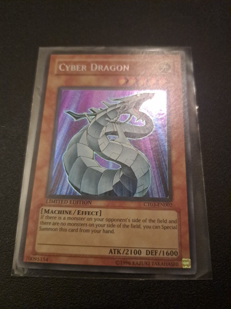 The Cyber Dragon CT03-EN002 2006 Collectors Tin Limited Edition card is a highly sought-after collectible in the Yu-Gi-Oh! TCG world. Manufactured by Konami in 2006, this Secret Rare card features a powerful Machine Creature type with a high Defense/Toughness of 1600 and an impressive Attack/Power of 2100. With its stunning Holo finish and limited edition status, this English-language card is a must-have for any collector or player looking to enhance their deck with a rare and valuable addition.