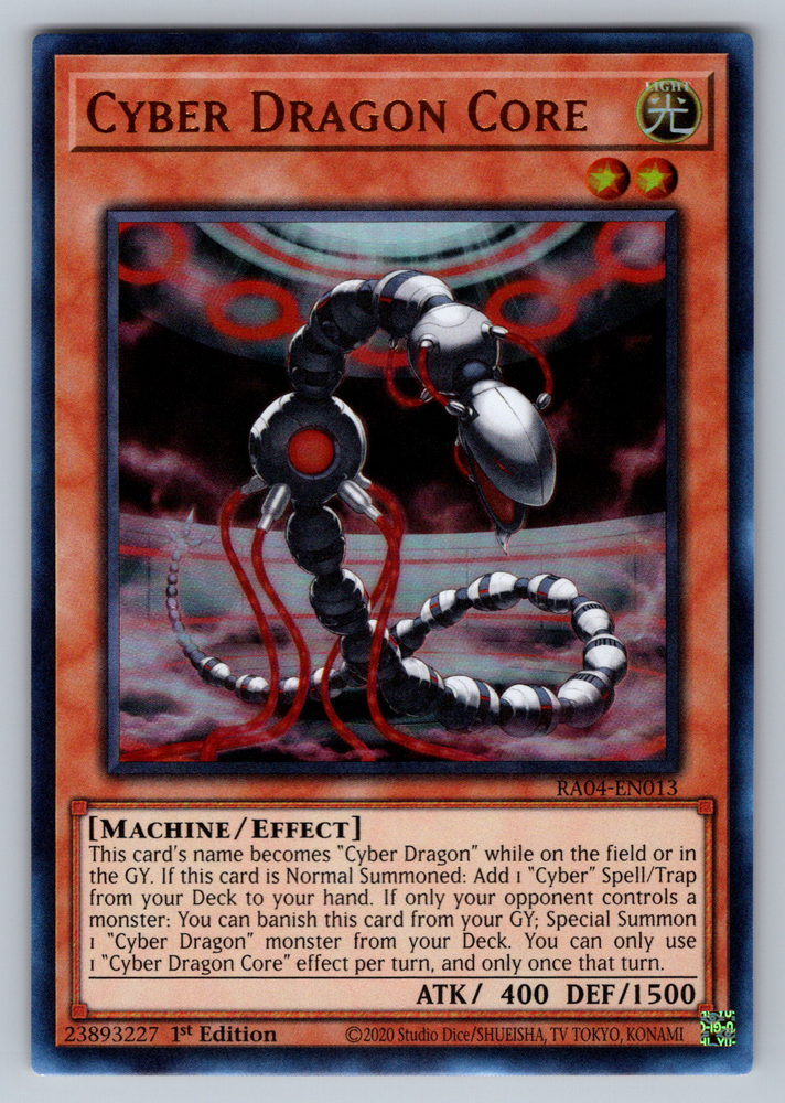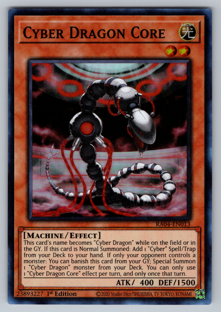 This listing is for Cyber Dragon Core - RA04-EN013 from the Quarter Century Stampede set . Each photo in this listing is a stock photo as this is a bulk variation listing. You will receive the same card in the same condition selected , but it may not be the exact copy from the photo . Therefore, centering on the card you receive may differ from the centering of the card listed in the photo. Please be aware of this before purchasing. Each card will be in Near Mint condition. Cards in this listing may have some very minor imperfections (such as few small dots of whitening or a couple of very small scratches), but there will be no major damage to the cards (such as excessive whitening, scratches, edgewear, creases, water damage, etc). The cards from your order will be securely packaged in a card saver and card saver perfect fit sleeve and shipped with the eBay Standard Envelope program for cards under $20. Whether you're looking to power up your deck or add this to your collection, you'll be sure to enjoy this card! Check out our other listings for more Yu-Gi-Oh! cards!