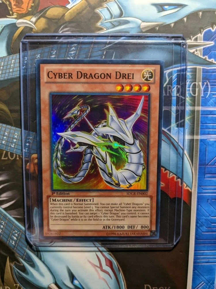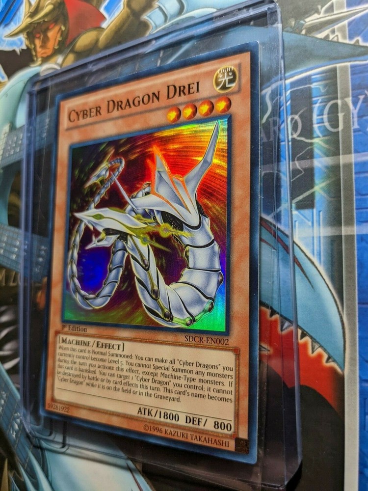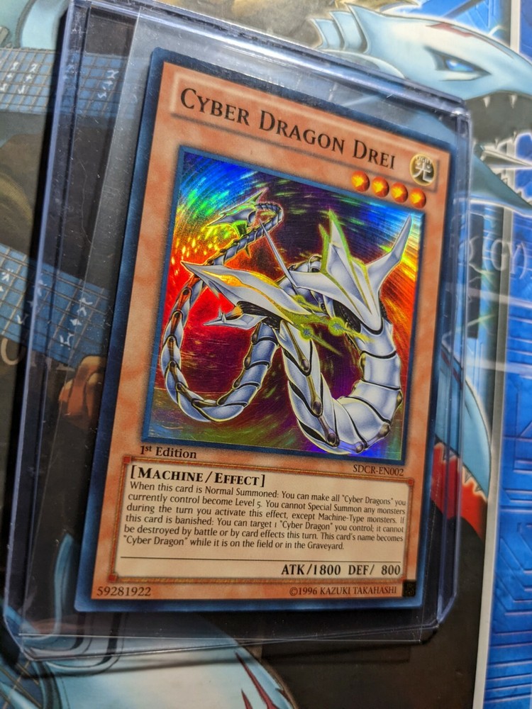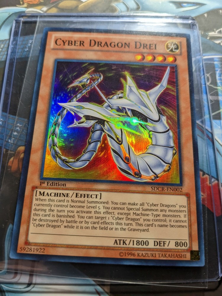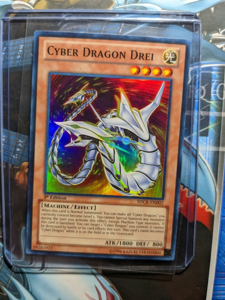 Cyber Dragon Drei SDCR-EN002 - 1st Edition Super Rare Holo Used Yugioh Card Feel free to reach out if you have any questions or concerns! I ship all cards in a single sleeve along with a plastic top loader as seen in the last image in the listing (For Free!). I also protect this in between two pieces of foam board to help prevent bending during shipping. Card(s) will be mailed in a bubble mailer not an envelope with Free Tracking! Free Shipping on orders above $5 USD! Bundled shipping is available and highly encouraged for huge discounts! International Buyers please note, I am based in the United States and ship globally through eBay's Global Shipping Program. You are responsible for any additional import charges. Any Trading Card orders will also receive a FREE random Non-holo trading card from any year from my personal collection (sometimes additional chance of bonus items especially for multi-card orders)! Are you a Trading Card Collector or TCG player? Save my store! I'll be listing my entire collection as quickly as I can! Pokemon, Yugioh, and Magic The Gathering! All Trading Cards are stored safely and cared for. They have been stored in a plastic card case and kept in a Storage Box, protected all these years. They were sleeved over time slowly. Please see images for condition as I try to ensure proper lighting/angles to show any and all possible scratches and other potential damage that you should know about. What you see is what you get!