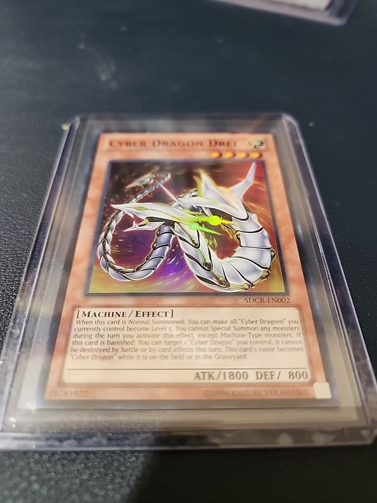 Elevate your Yu-Gi-Oh! TCG gameplay with the formidable Cyber Dragon Drei, from the Structure Deck: Cyber Dragon Revolution-1st Edition. As a Super Rare Effect-type monster, Cyber Dragon Drei packs a powerful punch with its 1800 attack power and 800 defense toughness. Its unique abilities allow you to ramp up your "Cyber Dragon" lineup and give you an edge in battle. Card Number SDCR-EN002, this Machine-type creature is a must-have for any serious player or collector. Featuring English text and manufactured by Konami, it adheres to standard card size dimensions, ensuring a seamless fit into your existing deck. Harness the strength of Cyber Dragon Drei to dominate your next duel.