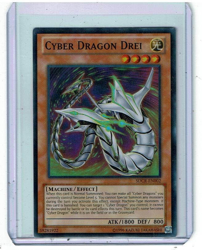 You are bidding on one, pack fresh, Cyber Dragon Drei, holographic Yu-Gi-Oh card. Card is near mint/mint. Card number SDCR-EN002. I have been selling on ebay since 2002 and have over 10,000 positive feedbacks, so bid with confidence. Payment is expected within 3 days of the end of auction notice. When you receive your card, please take a minute and leave feedback for me so I know you have received your card. I have an automated system that will then leave feedback for you Prices do fluctuate, so if you see something in my store that you are interested in, and the price seems off, feel free to message me and I will check what the card has been selling for over the last 30 days or so. I cannot guarantee I will change the price, but I will check it. Also, due to the costs involved with selling on ebay, and offering free shipping, no card will be sold for less than 1.50. SHIPPING COSTS are FREE All items are shipped within 48 hours of receipt of payment. PLEASE NOTE!!!!! If you have bought more than one card and are paying with Paypal, please send ONE payment for the total amount. If you do not know the total amount or are having any trouble, feel free to e-mail us for your total. Please feel free to e-mail us with any questions you may have. If you do not see the specific card you are looking for please e-mail us a list of the cards you are looking for and we will try to fill your list for you. All lists are filled on a first come first filled basis. MOST cards will be sold at 50 percent of the Beckett Price Guide. Please e-mail us for prices on specific cards. Thanks for looking!!! Terry`s Card Shop