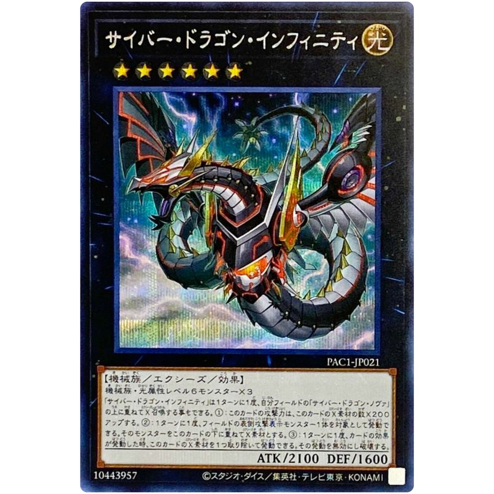 Item Discription PAC1-JP021 Cyber Dragon Infinity (alternate art) Front Back Card Name : Cyber Dragon Infinity (alternate art) Character : Cyber Dragon Infinity Rarity : Secret Rare Card Number : PAC1-JP021 Set : Prismatic Art Collection Type : Effect Xyz Monster Language : Japanese Card Condition : Near Mint Purchased cards will be clipped with cardboard, waterproofed, and shipped without any scratches or folds. Cards over $20 will be packed even tighter with a loader for each card. Shipping Policy Free shipping worldwide. Free shipping does not include tracking. There is an additional cost of US $4 for tracking. If you purchase cards totaling US $30 or more, you will receive a free tracking number. All of the products will be shipped from Japan. Economy Shipping Air mail ( no tracking ) Free Shipping Delivery time : About 2-4 weeks Standard Shipping Air mail ( with tracking ) US $4 Delivery time : About 2-4 weeks Expedited Shipping FedEx or EMS or DHL ( with tracking ) US $24 Delivery time : About 1-2 weeks Payment Policy We accept all major credit cards and Paypal payments. Return Policy We hope you will love your purchase, houever if you need to return it, we have a 30 day return policy. International Buyers Import duties, taxes, and charges are not included in the item price or shipping cost. These charges are the buyerʼs responsibility. Please check with your countryʼs customs office to determine what these additional costs will be prior to bidding or buying. If the cancellation is due to the buyer, wewill charge a fee. If there is a remote charge for your address, we will charge you for additional shipping. We are honored to receive the eBay Japan Awards 2022! I am thrilled to share that my store has won the eBay Japan Awards 2022 ! This amazing accomplishment wouldnʼt have been possible without our wonderful customers. A heartfelt thank you for your ongoing support. We will continue to improve our services, offering a diverse selection of items and top-notch customer care Thank you for helping us achieve this prestigous recognition, and we look forward to serving you in the future! Copyright ©️ 2023 Animart Japan
