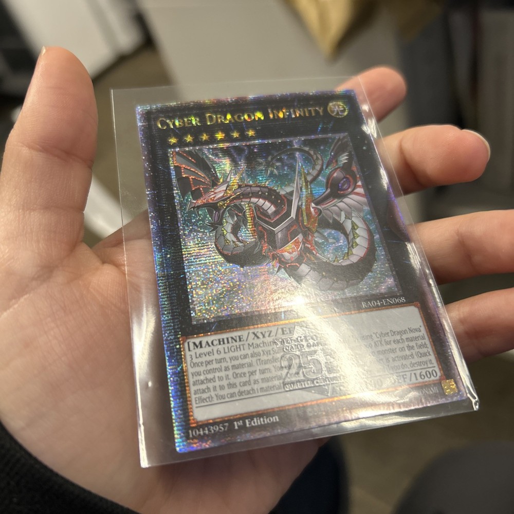 The Cyber Dragon Infinity (Alternate Art) (Quarter Century Secret Rare) card from the Quarter Century Stampede set is a highly sought after collectible in the Yu-Gi-Oh! TCG game. With its impressive attributes of Light attribute, Machine creature type, 1600 defense, 2100 attack power, and 1st Edition release, this card is a valuable addition to any deck. Manufactured by Konami, this Xyz and Effect card is a must-have for collectors and players alike. The English language card features stunning artwork and is numbered RA04-EN068, making it a rare and coveted item in the trading card game community.