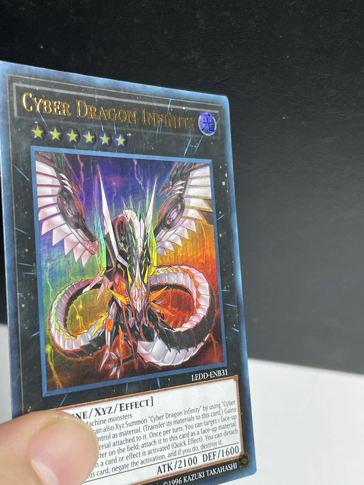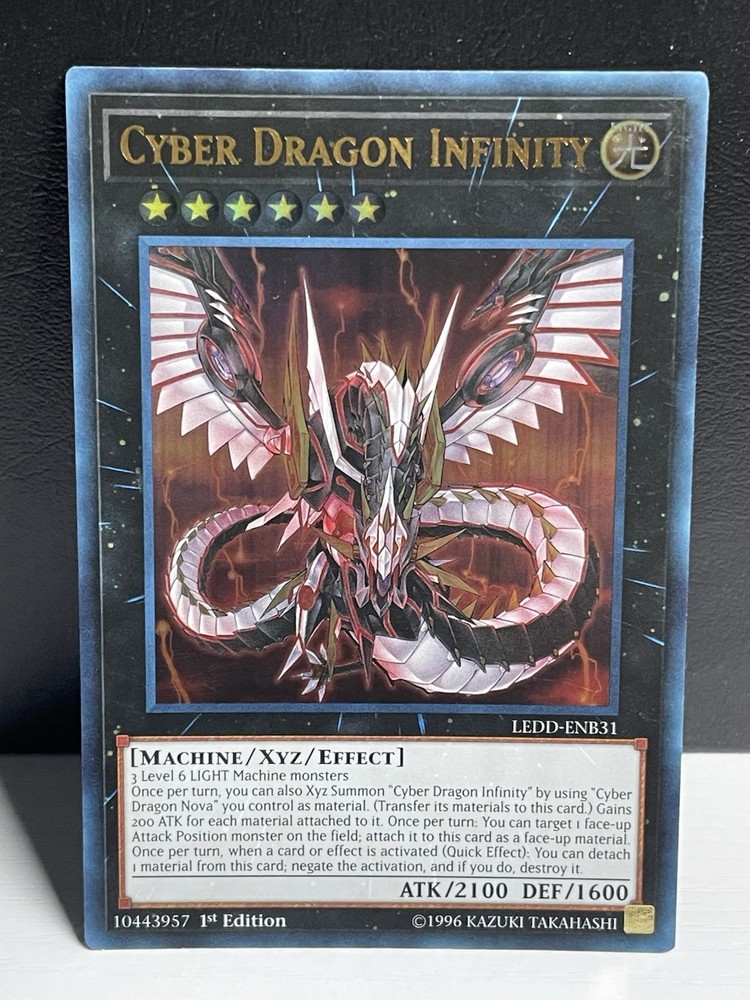 This Cyber Dragon Infinity card is a must-have for any serious YuGiOh! collector—Ultra Rare 1st Edition and in fantastic condition! I kept it safely sleeved in a binder, never played, so it’s crisp and ready for display or dueling. Ships securely in a sleeve and toploader for protection. A gem from my collection that any fan will love!