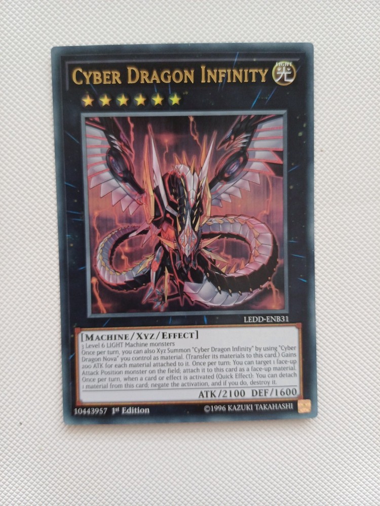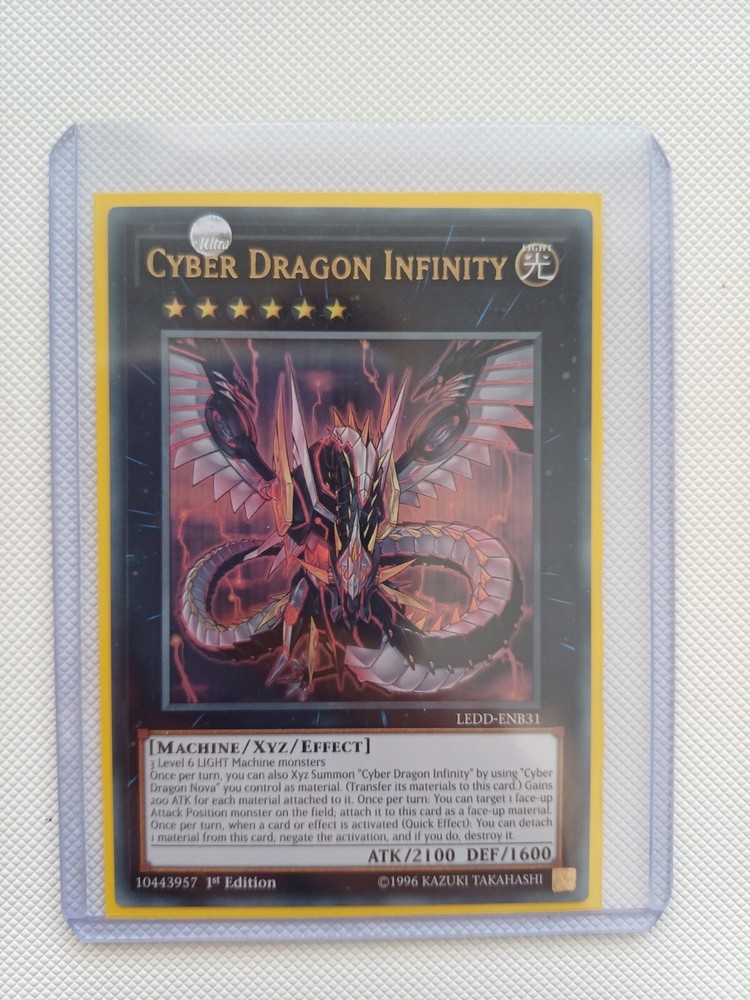 Cyber Dragon Infinity LEDD-ENB31 Ultra Rare Yugioh card 1st Edition Near Mint NM. Ultra rare Yugioh card from now hard to find Legendary Dragon Decks. Card is Near mint with no visible signs of wear other than slight whitening on top edge only visible from the back. Please judge condition for yourself before purchasing. Card will be protected by a sleeve and toploader as shown in last photo. No Returns accepted
