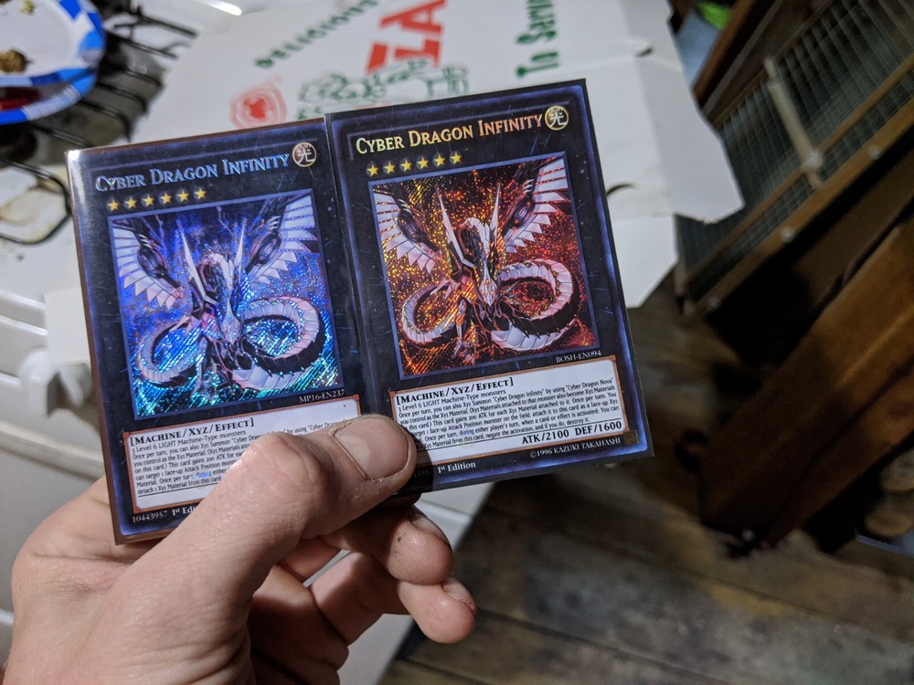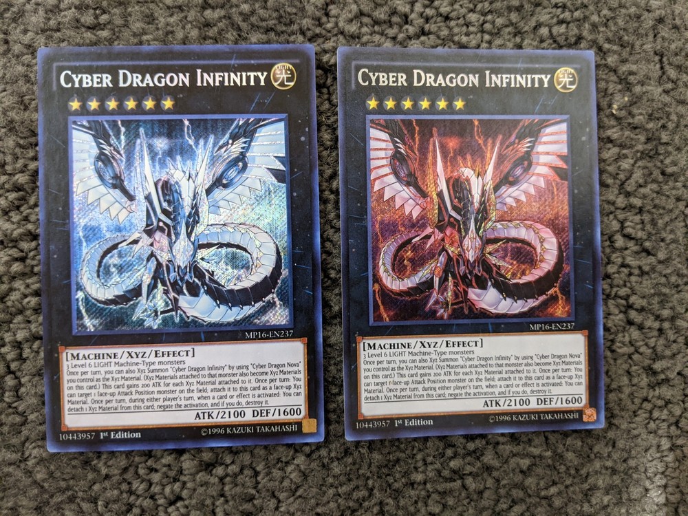 You are looking at an auction for a copy of Cyber Dragon Infinity (MP16-EN237) it is a colorless secret rare. The card itself has not been cut, no new ink or layers added and care has been taken to only alter the cards art box so that the card may be used in tournament or locals play (may be subject to your judge's discretion, better make sure they're a Cydra fan I guess) Ink has been modified with a light/filtering process that takes roughly three months and no, it isn't sun bleached (constant UVB ray exposure leads to bad and bendy cards so they have been avoided) The second card pictured is the card without alterations. I can/will be happy to combine the shipping of up to 6 cards for the price it takes to ship 1.