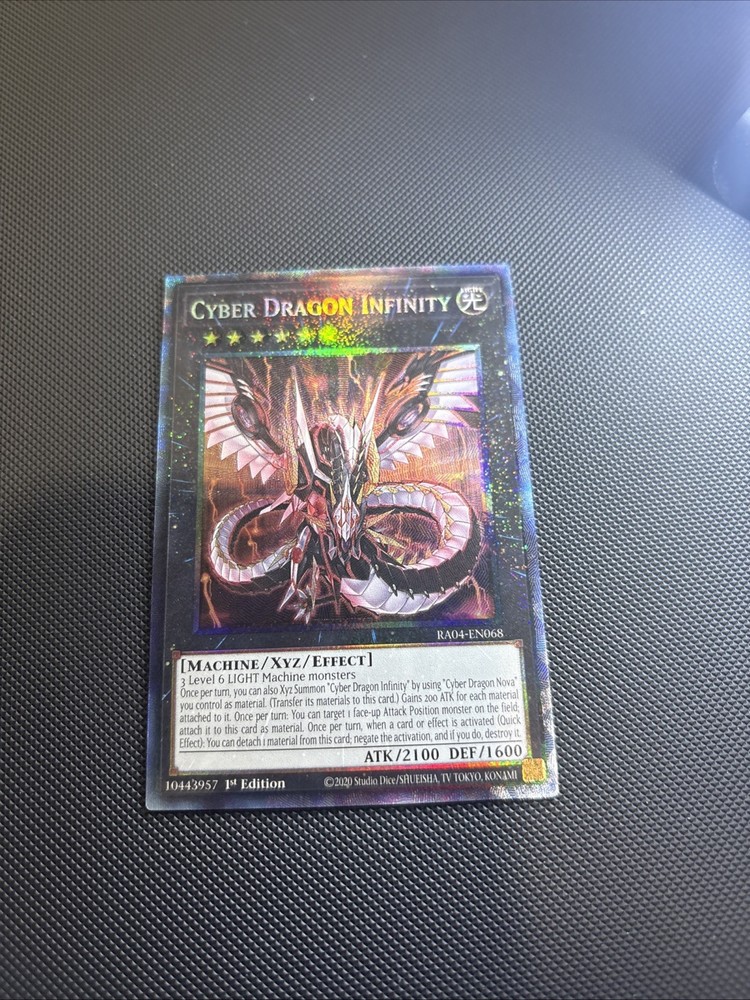 Elevate your Yu-Gi-Oh! TCG collection with the Cyber Dragon Infinity RA04-EN068 from the Quarter Century Stampede set. This Super Rare card boasts an impressive 1600 Defense/Toughness and 2100 Attack/Power, making it a formidable contender in any duel. Its unique Machine creature/monster type and Xyz, Effect card type offer strategic depth, while its 1st Edition status adds a touch of rarity and collectibility. Crafted by Konami and presented in English, this card features the attribute Color: Light and is part of the renowned set Quarter Century Stampede. Card Number: RA04-EN068 ensures you're getting a specific piece of the puzzle that can enhance your game or collection. Whether you're a seasoned player or a collector, Cyber Dragon Infinity is a must-have addition to your arsenal.