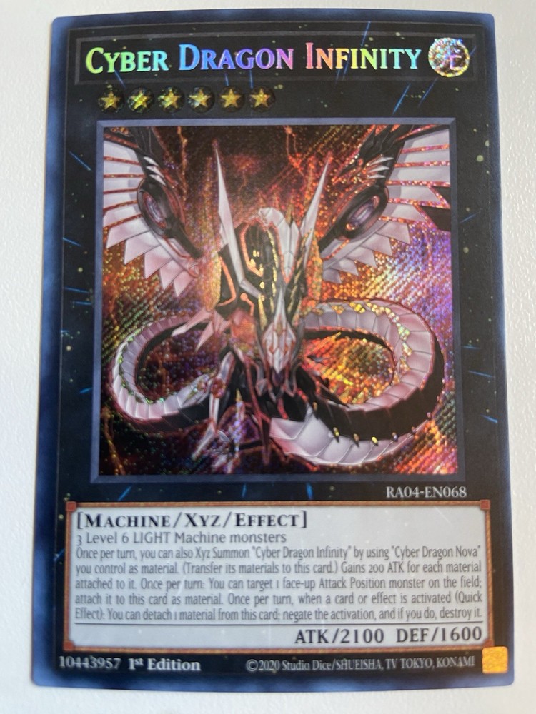 Cyber Dragon Infinity (Secret Rare) RA04-EN068 Quarter Century Stampede 1st Edition is a powerful Machine-type card in the Yu-Gi-Oh! TCG. With 1600 defense/toughness and 2100 attack/power, it can be a formidable addition to any deck. The card is an Effect/Xyz type and features the Light attribute. This card is a 1st Edition Secret Rare from the Quarter Century Stampede set and manufactured by Konami. The card is in English and has the card number RA04-EN068. Perfect for collectors or players looking to add some extra firepower to their deck.