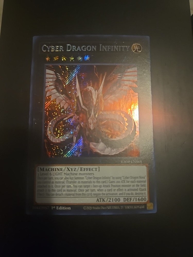 The Cyber Dragon Infinity card from the Quarter Century Stampede set is a highly sought-after Secret Rare collectible in the Yu-Gi-Oh! TCG. This Light attribute Machine-type card boasts an impressive Defense/Toughness of 1600 and an even higher Attack/Power of 2100, making it a powerful addition to any deck. Manufactured by Konami, this 1st Edition card features the unique Xyz and Effect card types, showcasing the iconic Cyber Dragon design. With its rarity and special release, this English language card is a valuable gem for collectors and players alike.
