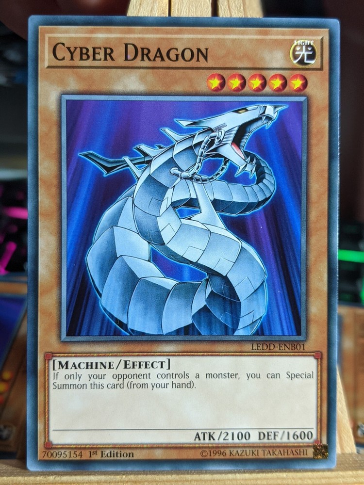 This Cyber Dragon LEDD-ENB01 card is a fantastic addition to any Yu-Gi-Oh collection! The seller clearly takes pride in their work—the card arrived in great condition, just as described, with no marks or warping. The careful restoration makes it look almost new, even as a 1st Edition LP/NM. Super happy with the purchase, and the seller’s attention to detail is impressive. Highly recommend for collectors!