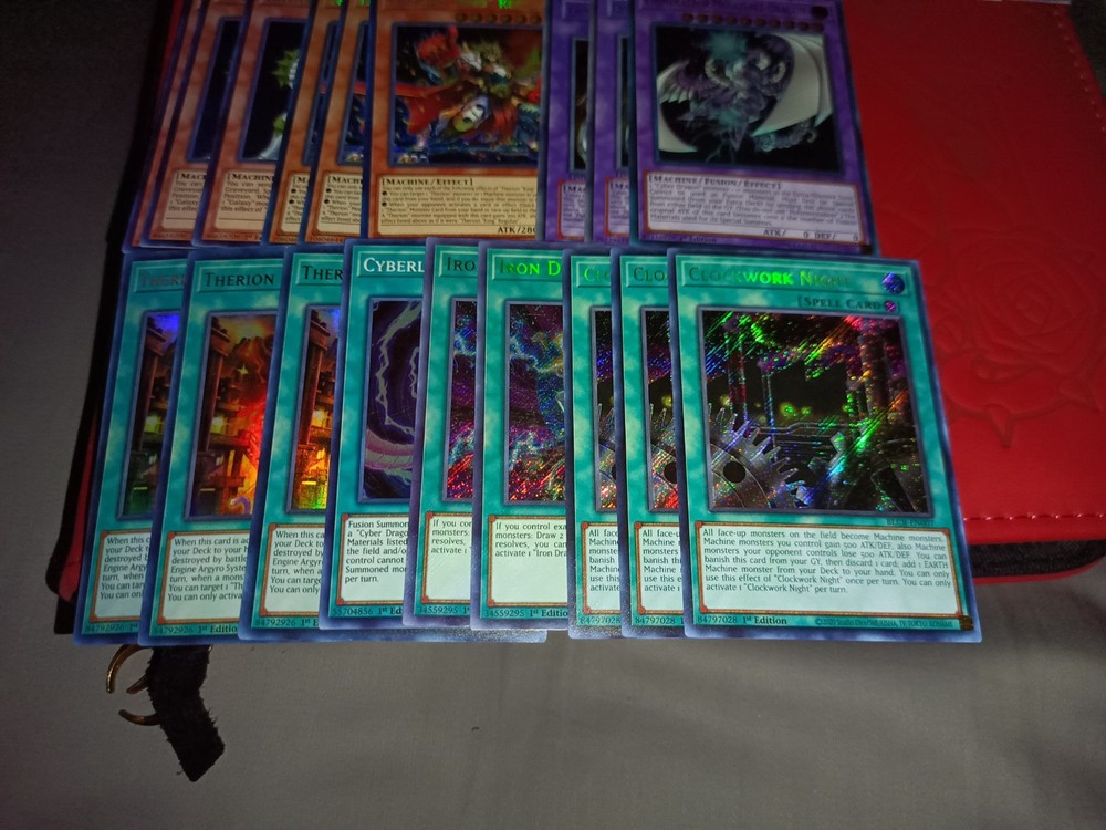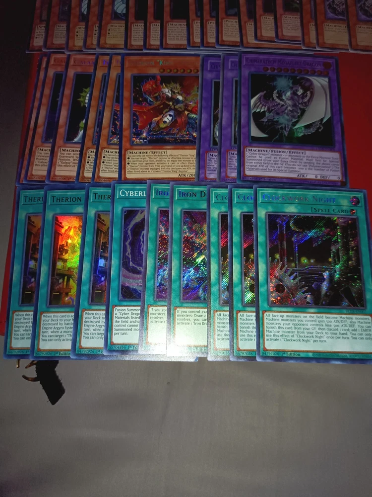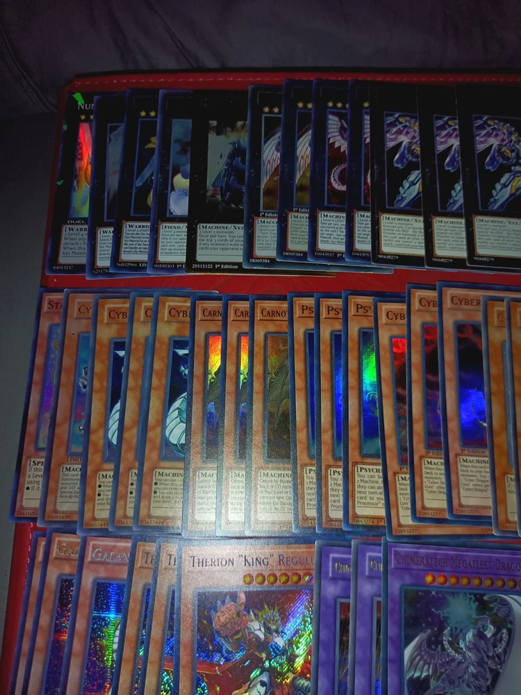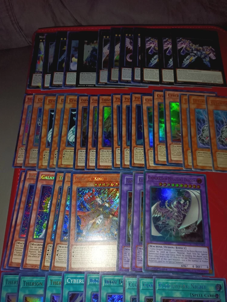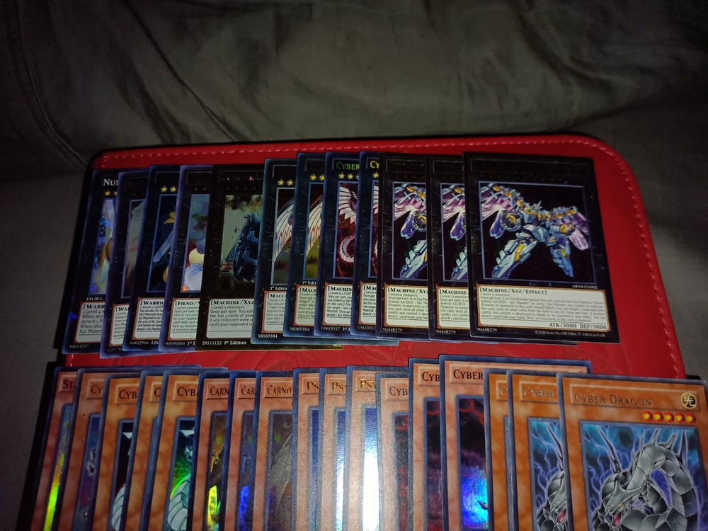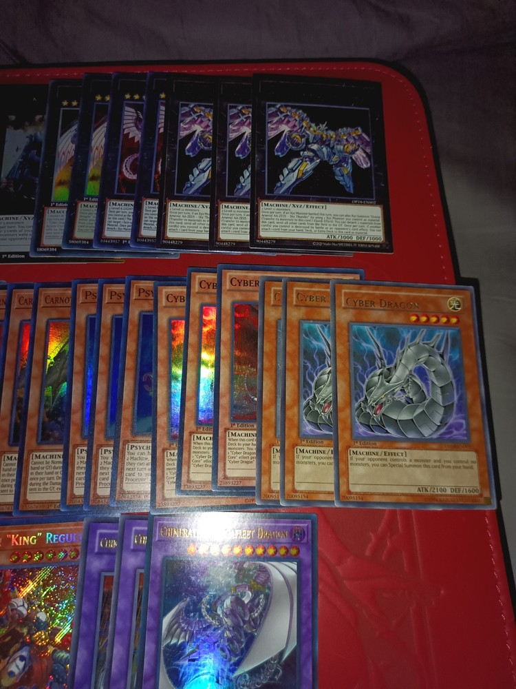 All cards are near mint to light play Tracking included Monsters Carnot the Eternal Machine x3 (PHNI-EN024 Ultra Rare 1st) Psychic Processor x3 (PHNI-EN081 Ultra Rare 1st Ed) Cyber Dragon Nova x2 (SDCR-EN038 Ultra Rare 1st Ed 1 NON ENGLISH) Cyber Dragon Infinity x2 ( BOSH-EN094 Secret Rare 1st Ed) Cyber Dragon x3 (Alternate Art DP04-EN001 Rare 1st Ed) Therion "King" Regulus " x3 (DIFO-EN007 Secret Rare 1st Ed) Star Drawing (AP05-EN008 Super Rare Unlimited) Cyber Dragon Core x3 (SDCR-EN001 Super Rare 1st Ed) Galaxy Soldier x3 (WSUP-EN010 Prismatic Secret Rare 1st Ed) Cyber Eltanin (JUMP-EN038 Ultra Rare Limited Edition Cyber Valley x3 (PTDN-EN010 Super Rare Unlimited) Chimeratech Fortress Dragon x2 (JUMP-EN031 Ultra Rare Limited Ed) Chimeratech Megafleet Dragon (LEDD-ENB00 Ultra Rare 1st Ed) Divine Arsenal AA-ZEUS - Sky Thunder x3 (OP18-EN002 Ultimate Unlimited) Digvorzhak, King of Heavy Industry (PGL3-EN064 Premium Gold Rare 1st Ed) Number 41: Bagooska the Terribly Tired Tapir (BLRR-EN085 Ultra Rare 1st Ed) Number 39: Utopia (DT07-EN034 Duel Terminal Super Parallel Rare) Number S39: Utopia the Lightning (YZ08-EN001 Ultra Rare Limited Ed) Cyber Dragon Sieger (CYHO-EN046 Ultra Rare 1st Ed) Salamangreat Almiraj x2 (BLHR-EN054 Secret Rare 1st Ed ( Spells: Clockwork Night x3 (BLCR-EN007 Secret Rare 1st Ed) Iron Draw x2 (BLRR-EN034 Secret Rare 1st Ed) Therion Discolosseum x3 (DIFO-EN053 Ultra Rare 1st Ed) Cyberload Fusion (LED3-EN014 Super Rare 1st Ed) Extra support cards will also include commons etc.