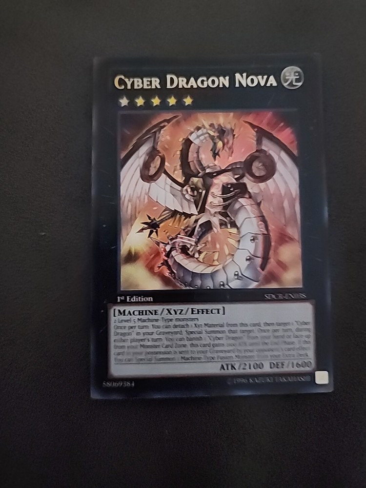 Experience the ultimate battle with Cyber Dragon Nova 1st Edition SDCR-EN038 from the Yu-Gi-Oh! TCG set. This Xyz card boasts 2100 attack power and 1600 defense toughness, making it a formidable opponent in any game. Manufactured by Konami, this collectible card game individual card is a must-have for any fan of the series. The card features the iconic Cyber Dragon Nova and is part of the Cyber Dragon Revolution set. Its attributes include an attack type and an XYZ card number. Add this rare and highly sought-after card to your collection today.