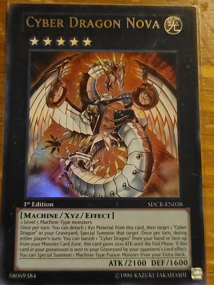 Dive into the world of high-tech duels with the Cyber Dragon Nova SDCR-EN038, a sought-after card for any Yu-Gi-Oh! TCG enthusiast. This card, featuring the iconic Cyber Dragon Nova in its first-edition print, is a must-have for collectors and competitive players alike, bringing a blend of power and strategic depth to the gaming table.Part of the - Yugi - set, this card is not just a valuable addition to your deck but also a treasured piece for those who appreciate the history and evolution of the Yu-Gi-Oh! trading card game. With its intricate artwork and impressive in-game capabilities, Cyber Dragon Nova stands as a testament to the enduring legacy of the series. This card has always been in a protective sleeve, aside from picturing for better viewing.