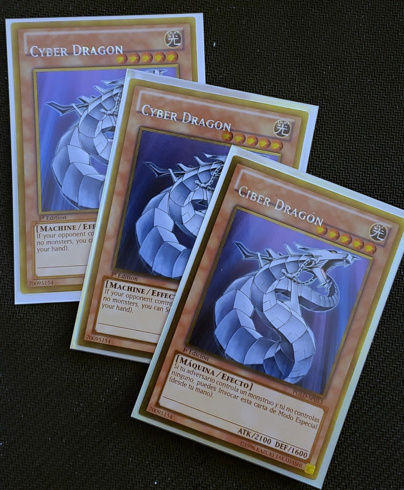 These Cyber Dragon misprints are amazing for collectors and duelists alike! The unique name shift and silver secret rare lettering make them stand out in any deck. The NM condition is flawless, and the mix of English and Spanish adds extra rarity. Fast shipping and secure packaging give peace of mind. A must-have for serious Yu-Gi-Oh! fans!
