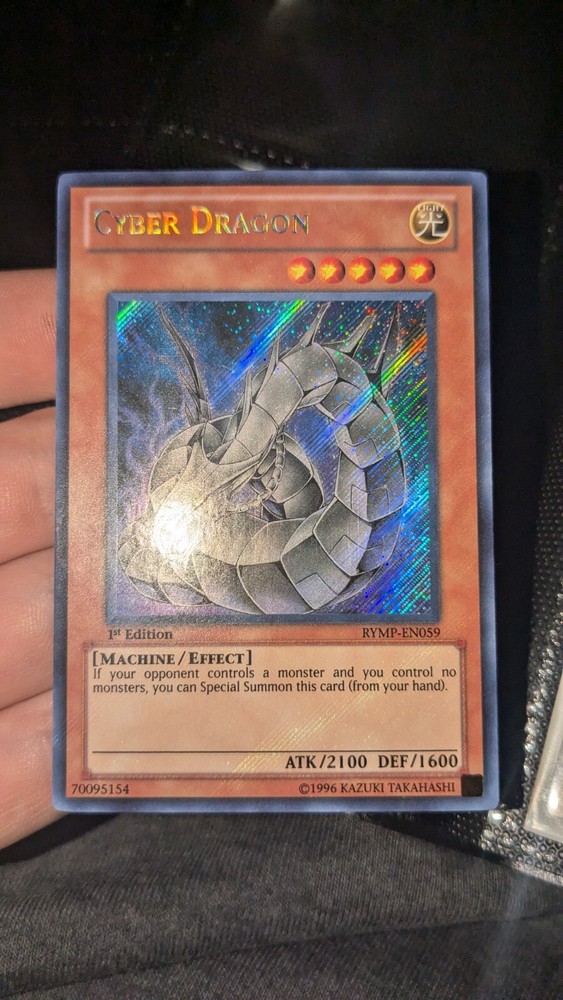 Elevate your Yu-Gi-Oh! TCG collection with the Cyber Dragon from the Ra Yellow Mega Pack, card number RYMP-EN059. Distinguished as a Secret Rare card, this Machine-type Effect Monster boasts an impressive 1600 defense and 2100 attack, making it a formidable addition to any deck. The card's unique attributes, combined with its 1st Edition status, make it a must-have for both players and collectors alike. Konami's commitment to quality is evident in the Cyber Dragon's English language print, ensuring that it is ready for both tournament play and display. With its light color scheme, this card not only stands out in a binder but also provides a strategic edge in gameplay. Whether you're looking to enhance your game or treasure a piece of Yu-Gi-Oh! history, this card is an excellent choice.