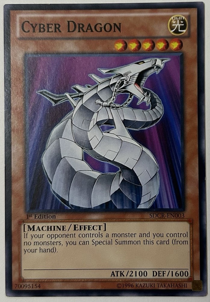 Yu-gi-oh! Cyber Dragon - SDCR-EN003 - Common - 1st Edition Condition: Near Mint. Language: English All photos are of actual card, unless mentioned otherwise. Card edition, rarity, etc. are listed in the title and description. Cards are in English unless otherwise stated in title or description. Items will be shipped within 2 business day upon receiving cleared payment. We ship Monday through Saturday in order to get the item(s) to you as quickly as possible Before leaving neutral or negative feedback, please contact us beforehand so we can discuss the issue. Feel free to message me with any questions you have regarding this item or my policies. Shipping Options: • USPS Mail - $1.25 ◦ Orders $19.99 (exc. sales tax) and under will be sent in a white envelope in a card saver + soft sleeve using eBay's Standard Envelope tracking service. ◦ Orders $20.00 (exc. sales tax) and over will be sent with free USPS tracking information w/ toploader + soft sleeve. • first class w/ tracking and insurance ◦ 2-3 Day shipping ◦ Orders will be shipped in a bubble mailer/ box in a toploader + soft sleeve. Card Grading: • Near Mint (NM) - Cards with this grade will show minimal to no wear from shuffling, play or handling and can have a nearly unmarked surface, crisp corners and unblemished edges outside of a few minimal flaws. Holographic cards are more scrutinized than non-holo cards. • Lightly Played (LP) - Cards with this grade may have a few dings, light playwear and/or edgewear. A few surface scratches are acceptable. A crease or bend is acceptable if it is less than approximately 1/2 inch in size and is only visible on one side. • Moderately Played (MP) - Cards with this grade may have dings, playwear and/or edgwear, 1 or 2 creases or bends that do not go through the length of the card. Cards may have a 1 or 2 deep scratches. • Heavily Played (HP) - Cards with this grade may have dings, playwear and/or edgwear, creases or bends that may go the length of the card, markings and/or coloring, tears on the edges. Despite being the lowest of grading, these cards are still tournament legal. If you receive a card not in the stated condition, please contact us to return the item for a full refund. Thank you for your interest
