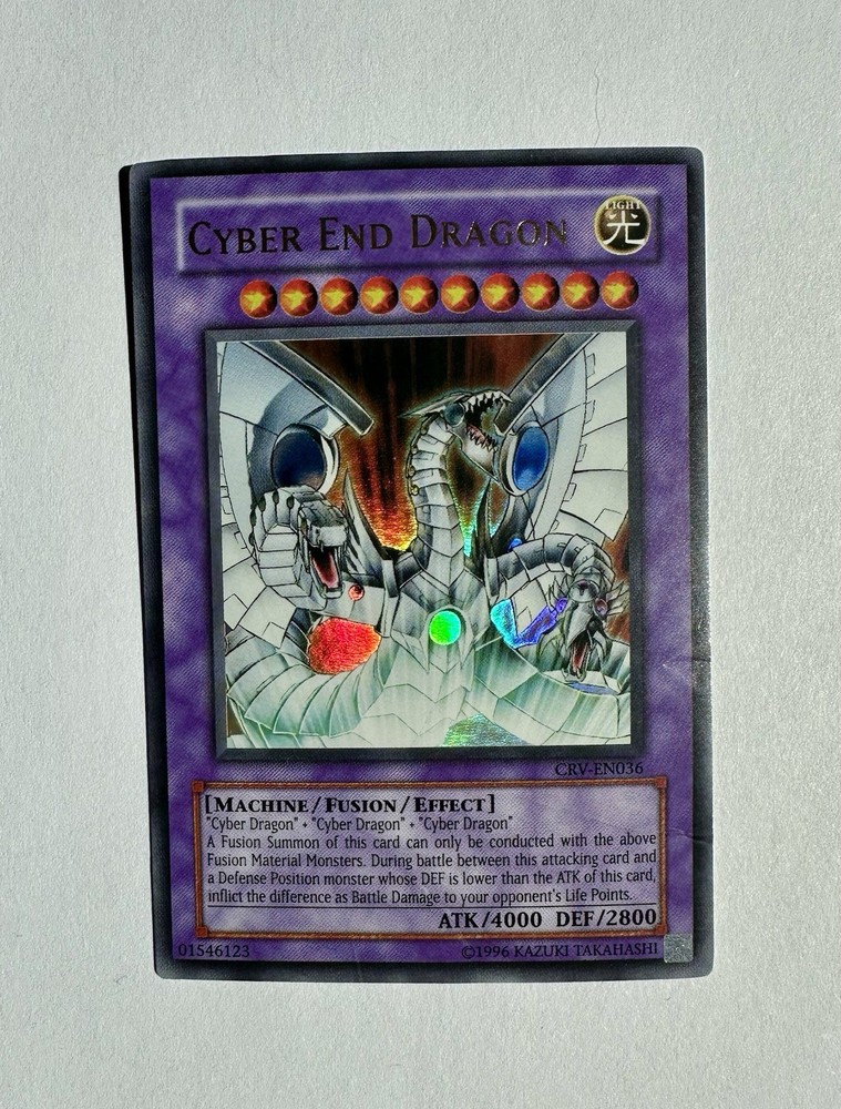 Elevate your Yu-Gi-Oh! TCG collection with the formidable Cyber End Dragon, card number CRV-EN036. This ultra-rare, unlimited edition card from the Cybernetic Revolution set is a must-have for both serious collectors and seasoned duelists. With an attack power of 4000 and a defense toughness of 2800, this Machine-type Fusion card is a powerhouse in both tournament and casual play. Crafted by Konami and featuring the iconic artwork that veteran players and new fans alike have come to adore, this English-language card adds versatility and strength to any deck. Whether you're looking to enhance your gameplay or complete a set, the Cyber End Dragon is an excellent choice for diversifying your card arsenal.