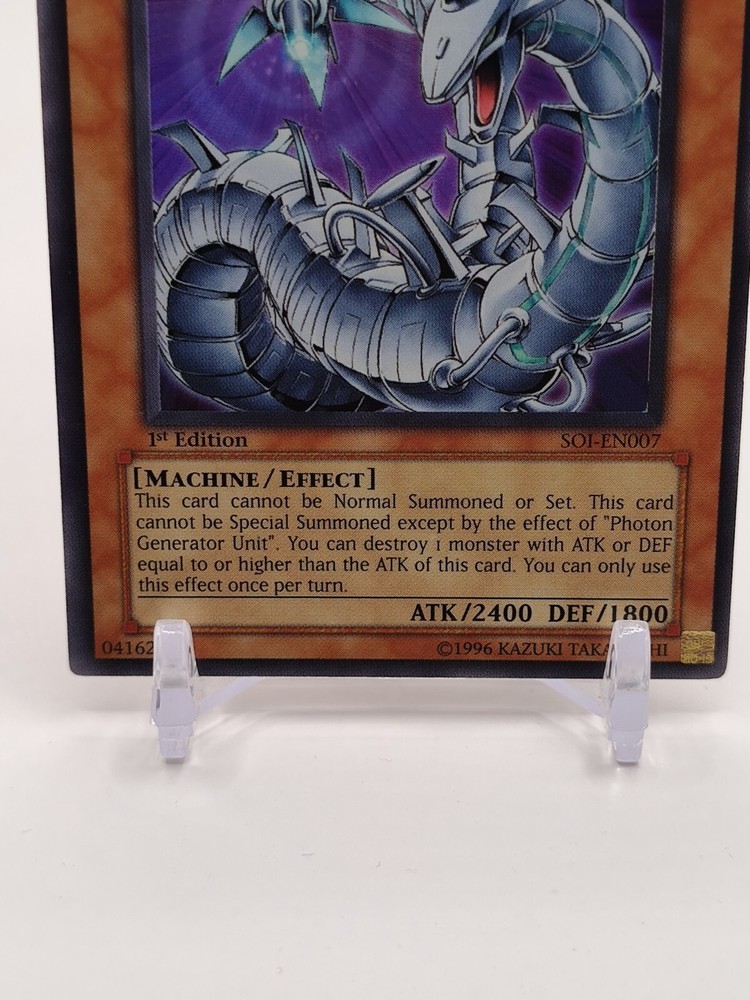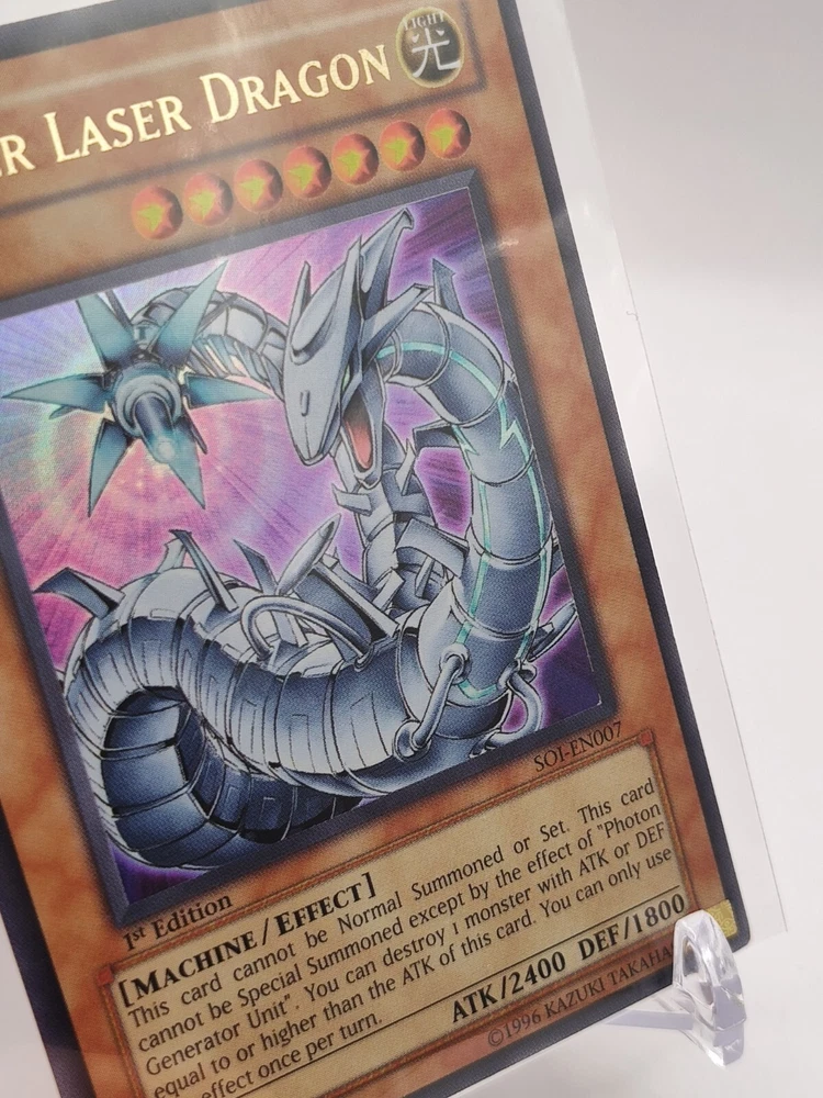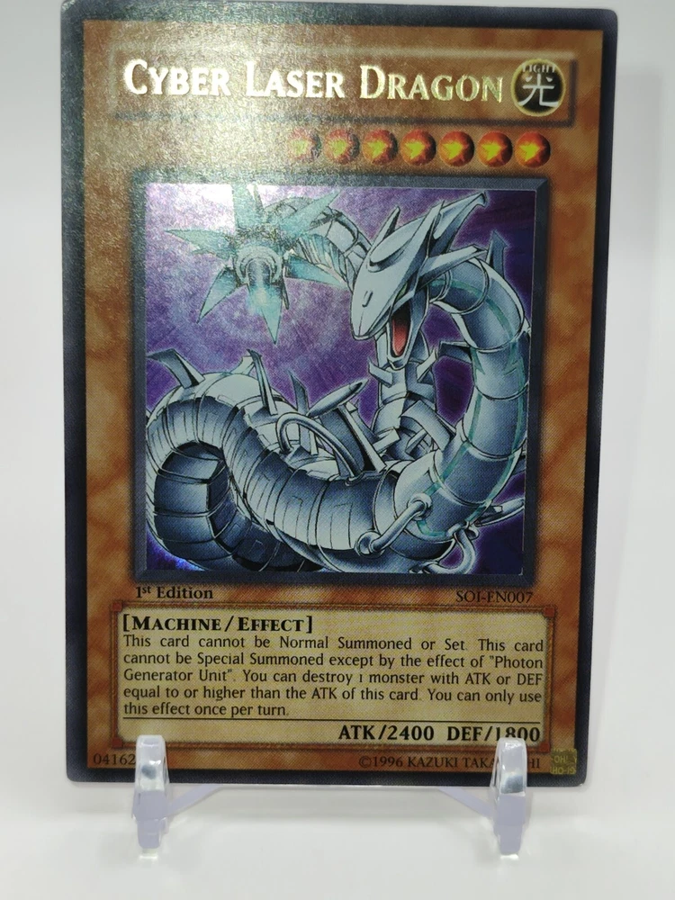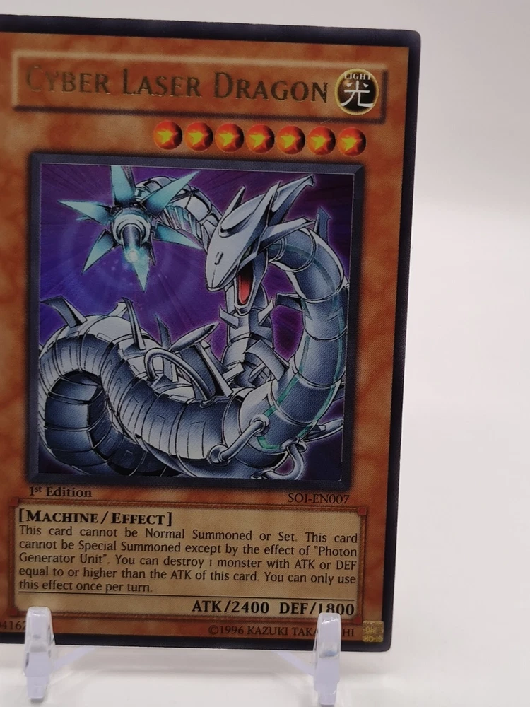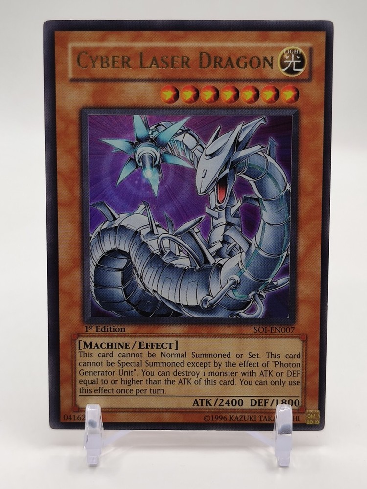Yu-Gi-Oh! Cyber Laser Dragon SOI-EN007 1st Edition Ultra Rare You will receive the card as pictured and titled in the listing. Condition is shown in the pictures. If you would like to see more pictures or video, please feel free to message me. Card(s) will be mailed safely and securely. Packaged within a standard penny-sleeve that is then put into a toploader. The toploader is taped(painters) shut, then rubber banded between cardboard. I then wrap the parcel in bubble wrap before placing it the bubble mailer. I do place additonal wrap in the mailer as well to minimize any movement.