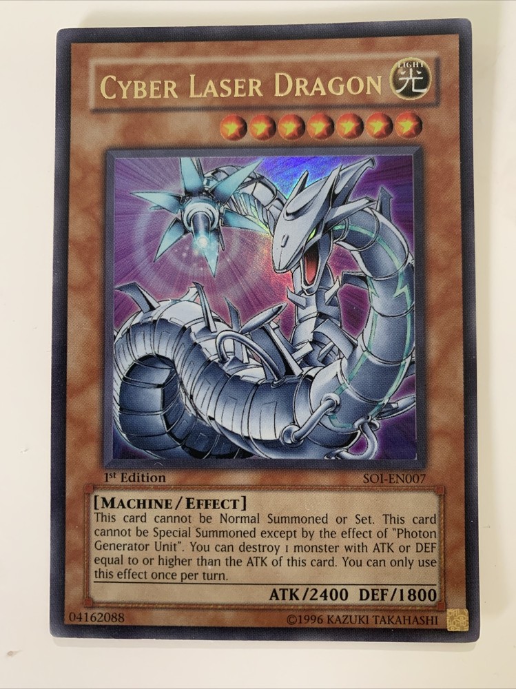 Cyber Laser Dragon SOI-EN007 is an Ultra Rare Unlimited edition card in near mint or better condition. This English-language Yu-Gi-Oh! TCG card features the iconic character Cyber Laser Dragon, making it a must-have for collectors. Manufactured by Konami, this card comes in a standard size and is perfect for any fan of the game.