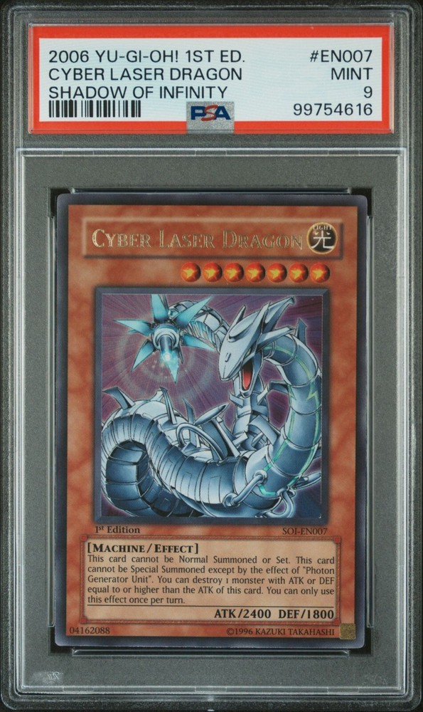 This listing is for 1copy of Cyber Laser Dragon SOI EN007 Ultra Rare graded PSA 9. The card pictured is the card you will receive. No internationalshipping. Please feel free to reach out with any questions.