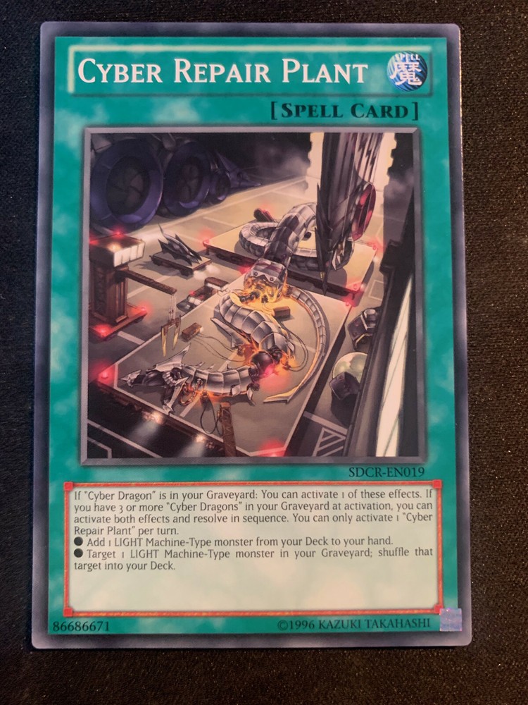 Cyber Repair Plant - SDCR-EN019 - Cyber Dragon Revolution N/M Card is Unlimited Card is in Near Mint Condition Pulled from a Recently Opened Structure Deck Combined Shipping is offered on all of my TCG Listings. When Checking out with multiple cards in your cart, click ‘Request total from seller’. This will allow me to combine the shipping for multiple cards if purchased together. If this does not show up for you, then please message me and I’ll create a listing for your order. Any Further Questions Please Message Me Thanks