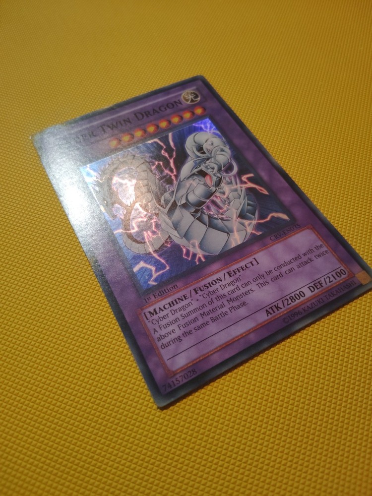 This Cyber Twin Dragon is a stunning addition to any Yu-Gi-Oh! collection—the holographic finish really makes it pop! As a 1st Edition Ultimate Rare, it’s both a competitive powerhouse and a collector’s dream. The card’s condition is solid, and the iconic artwork looks amazing in any deck or display. A must-have for serious duelists and fans of the Cyber archetype!