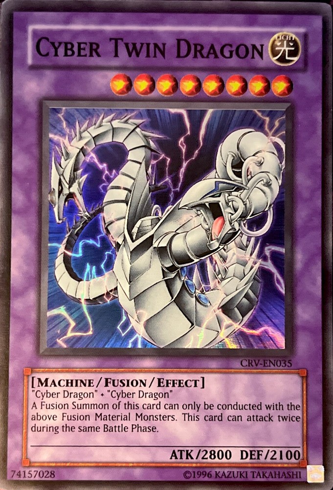 The "Cyber Twin Dragon" card is from the "Cybernetic Revolution" set of the Yu-Gi-Oh! TCG. It is a Super Rare card with attributes of Light color, belonging to the Machine Creature/Monster Type. The card has impressive stats with 2800 Attack/Power and 2100 Defense/Toughness. It is an Effect Fusion card, marked with the card number CRV-EN035 and manufactured by Konami. The card is in English language and is an Unlimited edition.