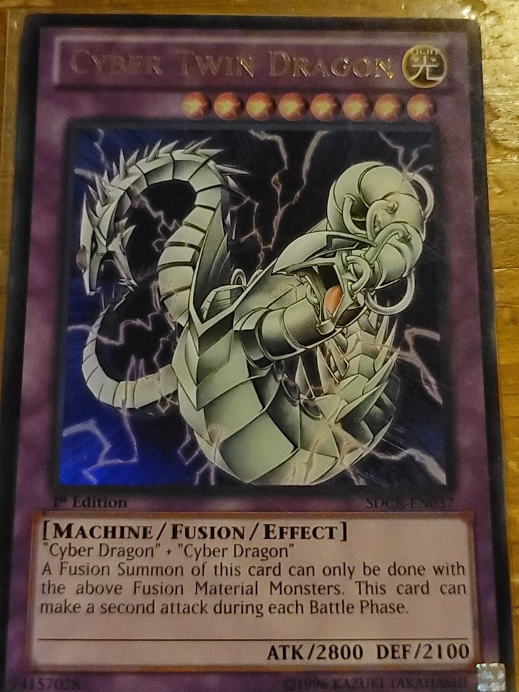 Unleash the power of the Cyber Twin Dragon with this sought-after Yu-Gi-Oh! TCG card from the - Yugi - set. Model number SDCR-EN037 marks this card as a unique addition to any collection, especially for enthusiasts seeking the rare 1st Edition variant. Its inclusion in your deck can tip the scales in your favor, providing a strategic edge during gameplay.The card's pristine design showcases the intricate artwork that fans have come to appreciate from the Yu-Gi-Oh! series. Whether you're a seasoned player or a collector, the Cyber Twin Dragon card is a must-have, enhancing both your gameplay experience and the visual appeal of your collection. This card has always been in a protective sleeve, aside from picturing for better viewing.