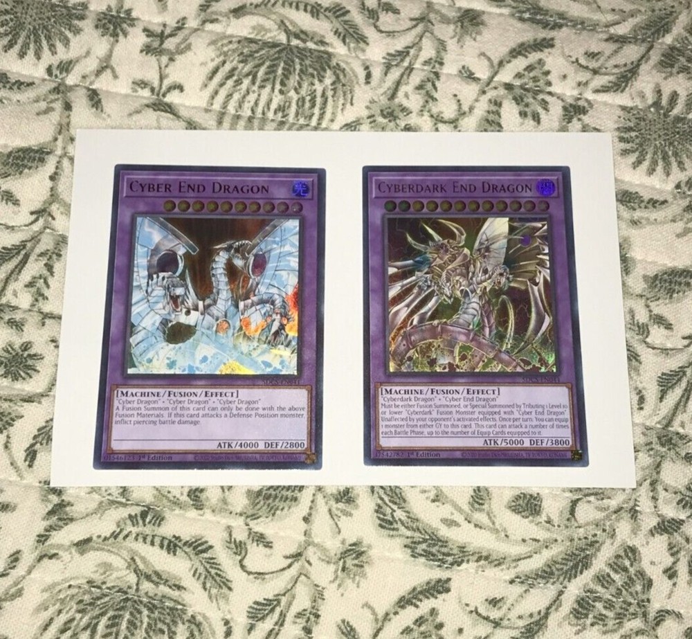 Cyber End Dragon "Cyber Dragon" + "Cyber Dragon" + "Cyber Dragon" A Fusion Summon of this card can only be done with the above Fusion Materials. If this card attacks a Defense Position monster, inflict piercing battle damage. Cyberdark End Dragon "Cyberdark Dragon" + "Cyber End Dragon" Must be either Fusion Summoned, or Special Summoned by Tributing 1 Level 10 or lower "Cyberdark" Fusion Monster equipped with "Cyber End Dragon". Unaffected by your opponent's activated effects. Once per turn: You can equip 1 monster from either GY to this card. This card can attack a number of times each Battle Phase, up to the number of Equip Cards equipped to it.