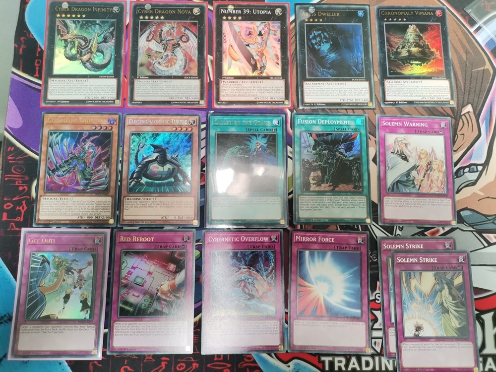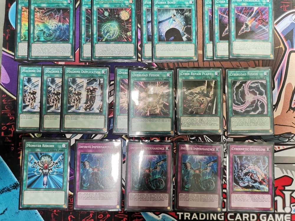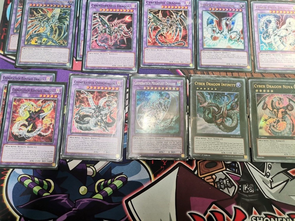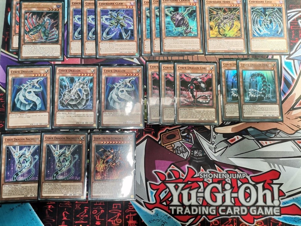 Yugioh cyberdark tournament deck Main deck : x2 cyberdark chimera, x3 cyberdark claw, x3 cyberdark cannon, cyberdark horn, cyberdark edge, x3 cyber dragon, x3 cyber dragon core, x2 cyber dragon hertz, x2 cyber dragon nachster, x1 jizukiru the star destroying kaiju Spells : x2 cybernetic horizon, x2 cyberdark realm, x2 power bond, x3 cyber emergency, x3 machine duplication, x2 overload fusion, cyberload fusion, cyber repair plant, monster reborn Traps : x3 infinite impermanence, cybernetic overflow. Extra deck: x2 cyberdark end dragon, x2 cyberdarkness dragon, cyberdark dragon, cyber end dragon, cyber twin dragon, x2 chimeratech rampage dragon, chimeratech overdragon, chimeratech megafleet dragon, cyber dragon infinity, cyber dragon nova, cyber dragon sieger. Side deck: cyber dragon infinity, cyber dragon nova, number 39 utopia, abyss dweller, chronomaly vimana, cyberdark chimera, electromagnetic turtle, called by the grave, fusion deployment, x2 solemn strike, solemn warning, red reboot, cybernetic overflow, get out, mirror force All cards are in brand new condition or with tiny imperfections.