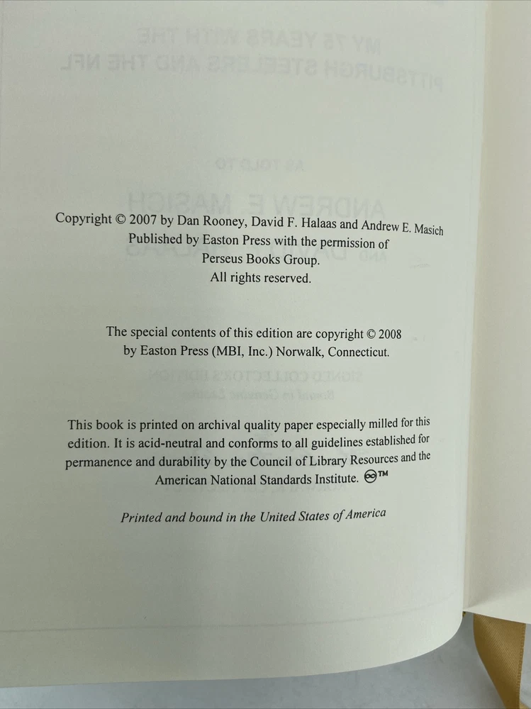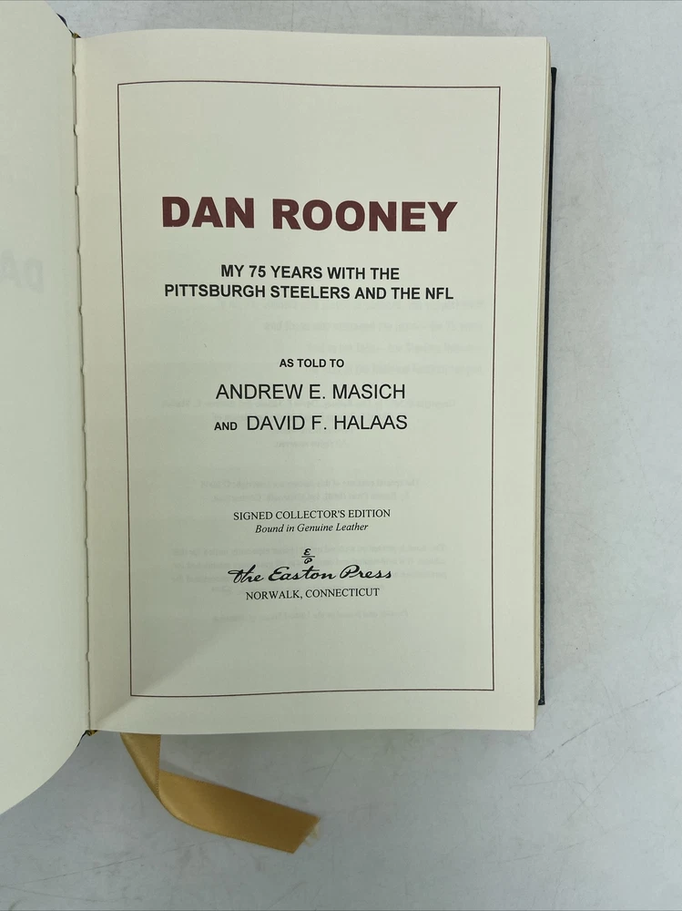 DAN ROONEY 75 YEARS WITH THE PITTSBURG STEELERS Easton Press SIGNED FINE. Book is in very good condition. Does show very minor wear. Book has no visible marks, notes or highlights throughout the book. Book has a signature from the author. Please see pictures for accurate details. Free shipping