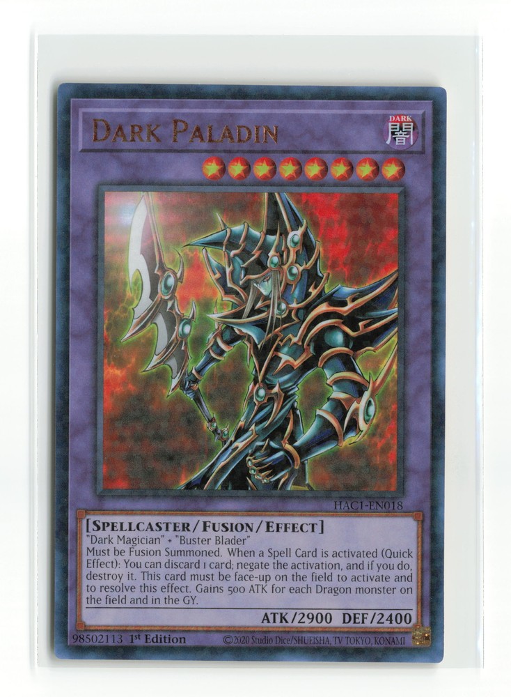 DARK PALADIN HAC1-EN018 1ST DUEL TERMINAL YUGIOH TCG NM Pictures are image scans of actual card, there may be some vertical or horizontal lines, or smudges(on optic base cards / glossy white cards) which are not on the actual card You will receive the card similar to the one shown on the photos in quality (most of the time it will be the exact item unless there are multiple quantities or quantities sold), however if the card value is over $20 you will receive the exact card as shown in the photos or photo scans. *Card centering can vary but similar to photos.* Raw Card Conditions Sports Cards Unless noted with a "READ" in the title all cards are listed in the conditions below. Modern cards Modern cards are listed as near mint conditions. They can have 1-2 slight imperfections such as a dimple, a small surface scratch/nick, a light print line, or a very light soft corder which may not be disclosed. Vintage cards (2010 and older) Vintage cards are listed as excellent condition which have clearly visible signs of wear. These cards have rough edges, moderate chipping, minor discoloration, minor indentation, fuzzy corners, or noticeable scratches. Pokemon and other TCG The card Conditions are describe in the title with NM, LP, MP, HP, and Damaged. For Near mint there could be some slight imperfections on card such as very light whitening on the back. Shipping Methods We offer free shipping on most cards! *All cards will come at least 1 top loader or card saver. If multiple card orders some may be combined into a card saver (up to 4 per card saver and up to 12 cards per eBay Standard Envelope.) All orders total under $20 (after discounts and promotion) and quantity less than or equal to 12 will be shipped with at least two top loaders or card savers depending on card values in a plain white envelope or rigid mailer with eBay standard envelope tracking. This could take up to 10 business days and sometimes not scanned by USPS therefore kindly allow some time before reaching out. All orders over $20 will shipped with a bubble mailer or box through USPS ground advantage or priority. Orders over $250 will need signature verifications. Return Policy We only accept returns on rare circumstances where items are not as described. Please review images and descriptions carefully before purchasing. Before leaving any negative feedbacks please reach out to us and we will try our best to resolve any issues you may have.