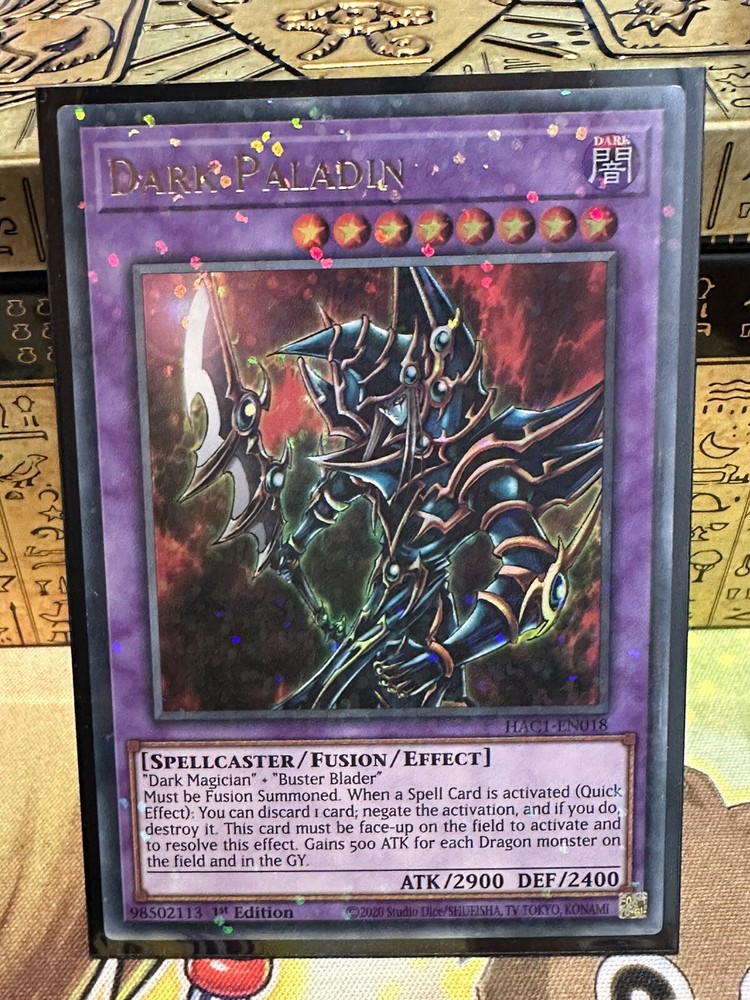 This Yu-Gi-Oh! TCG card is a 1st edition ultra rare Dark Paladin from the Duel Terminal 1 set. It features the attribute of darkness and is recommended for children aged 7 years and above. The card is gender-neutral and belongs to the character family of Yu-Gi-Oh. It is a non-domestic product and has not been modified. The card name is Dark Paladin and it belongs to the game of Yu-Gi-Oh! TCG.