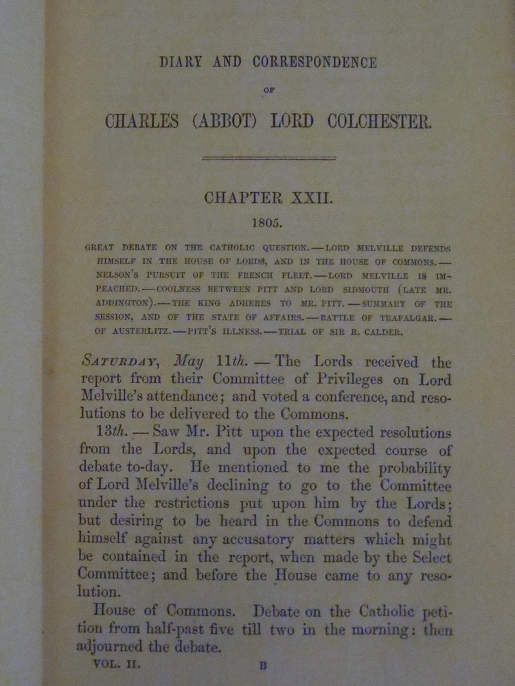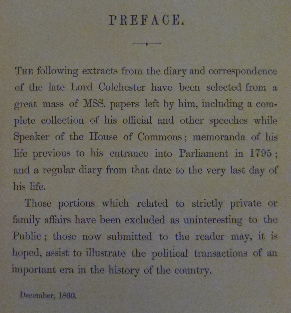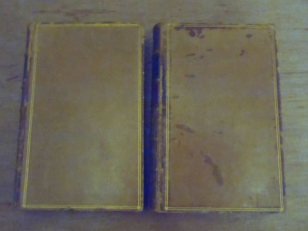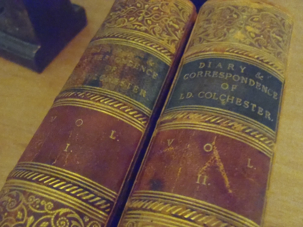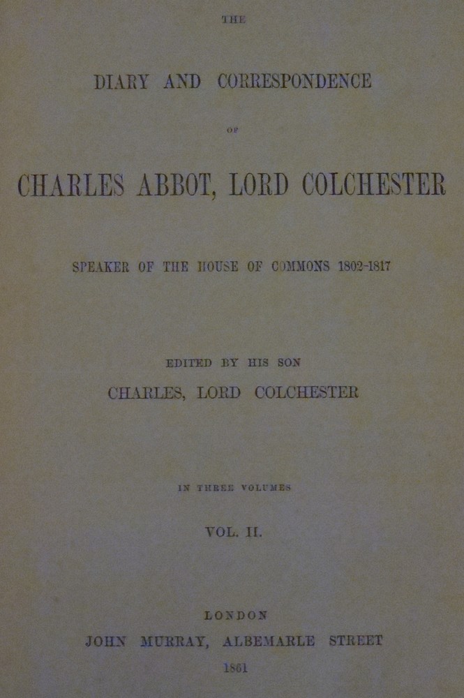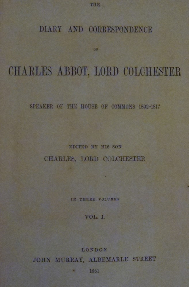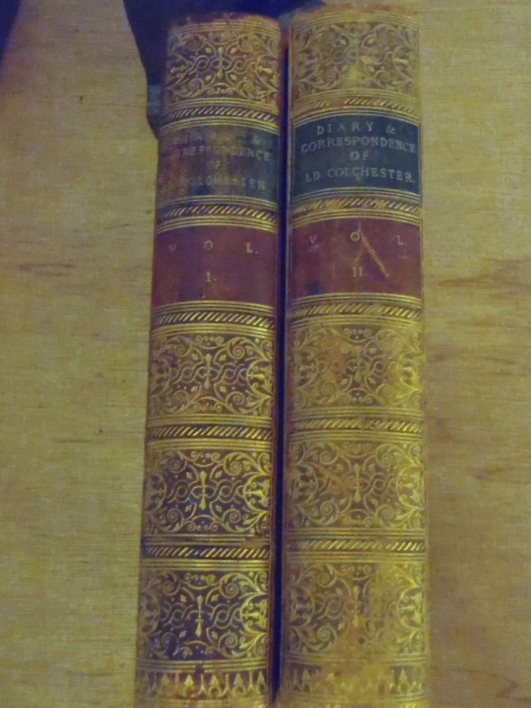 DIARY & CORRESPONDENCE of CHARLES ABBOTT COLCHESTER 1861 2 of 3 Vols Leather Set DIARY & CORRESPONDENCE of CHARLES ABBOTT COLCHESTER 1861 2 of 3 Vols Leather Set POB#55421 TITLE: Diary and Correspondence of Charles Abbot, Lord Colchester PUBLISHER: London: John Murray, Albemarle Street DATE: 1861 DESCRIPTION: I, 559 pages, Covers attached, spine caps rubbed but full. II, 620 pages. Covers stained, joints solid, 5lbs. CONDITION NOTES: Volumes 1 & 2 of 3 volume set. VERY GOOD. Solid page and cover attachment, but joints are rubbed and one front fly page in Volume 2 partly sprung. Caps full but rubbed. Corners rubbed and scrapes to with losses to gilt ruling. Stains to covers. Pages fresh and clean without foxing, but corner creases to Volume 2 in a section near an edge bump. BINDING: Full polished tan calf. All edges trimmed and marbled. . Listing and template services provided by inkFrog