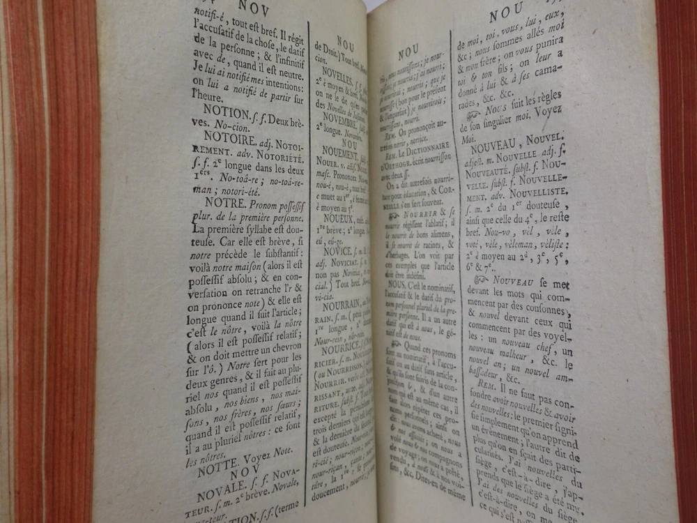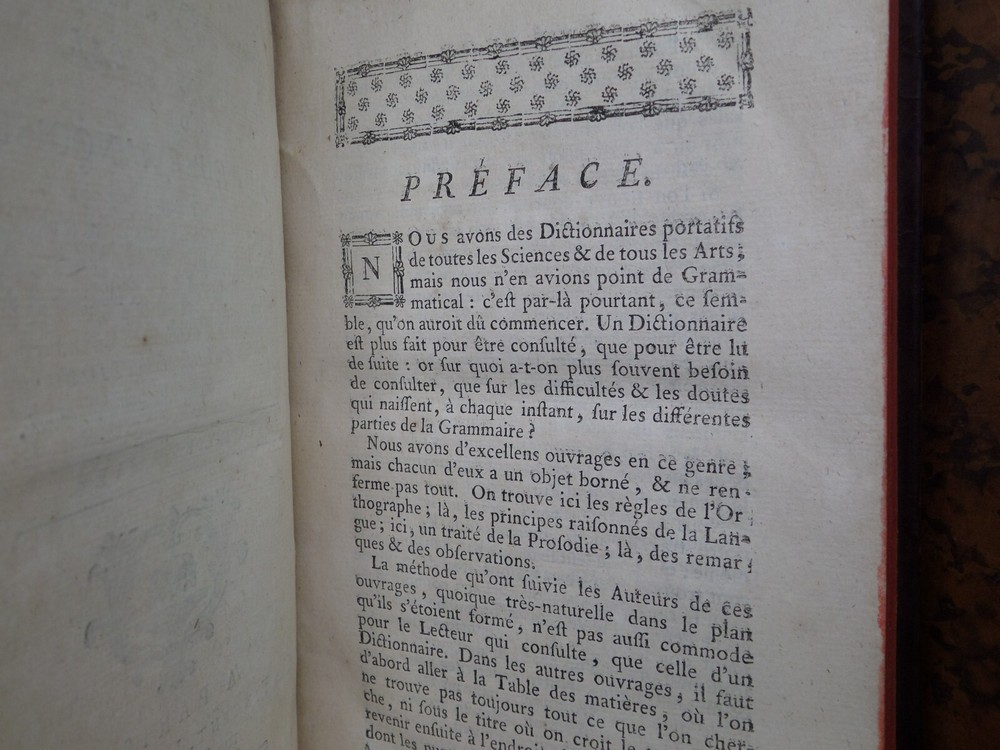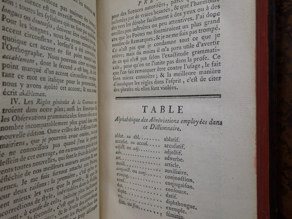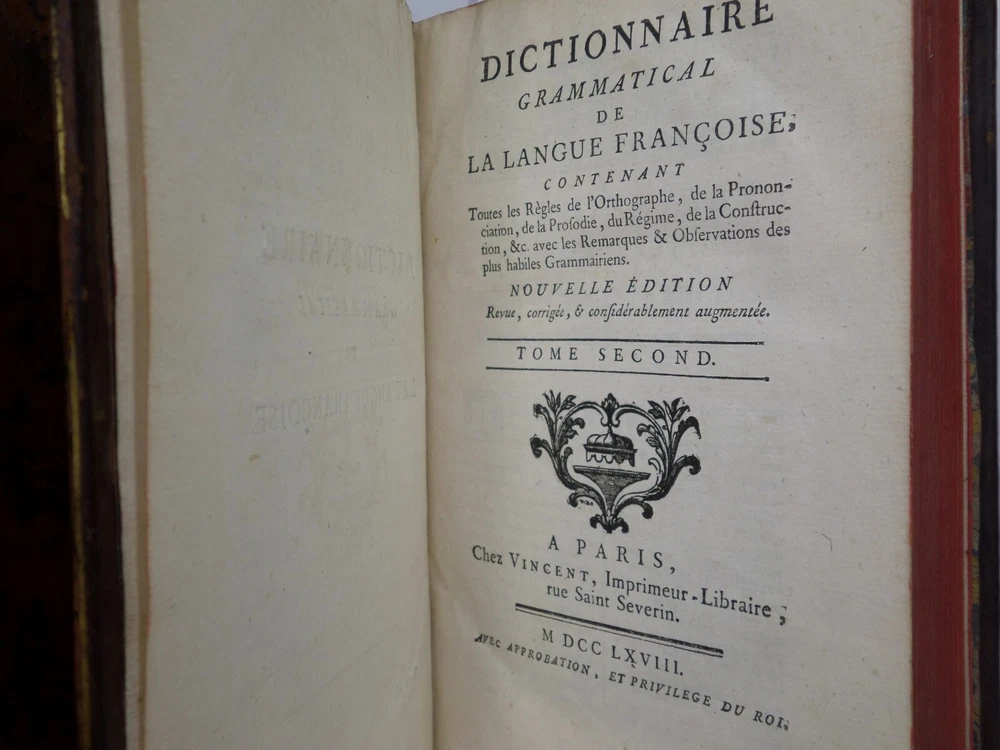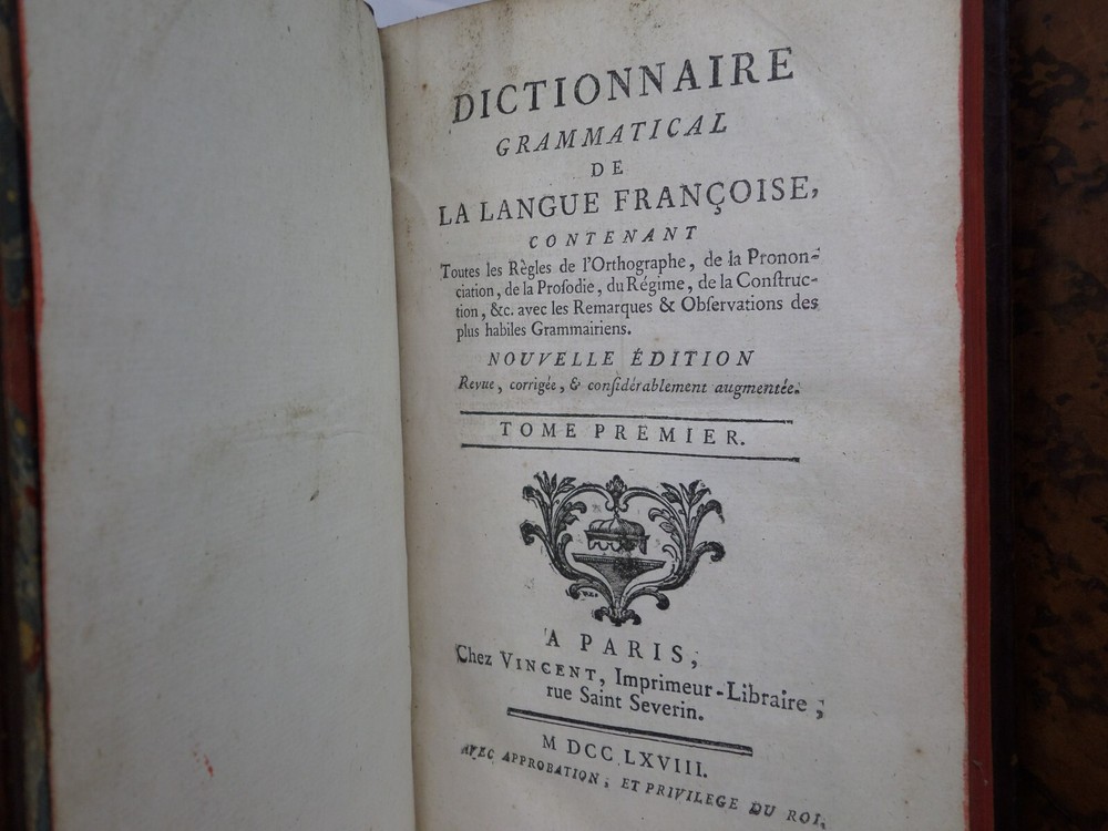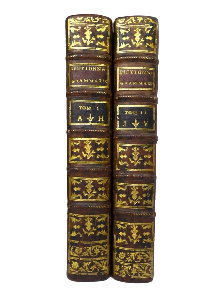 [FERAUD, Jean - François (1725 - 1807)]. Dictionnaire Grammatical de la Langue Françoise. Contenant toutes les Règles de l'Orthographe, de la Prononciation, de la Prosodie, du Régime, de la Construction, et avec les Remarques et Observations des plus habiles Grammairiens. A Paris, Chez Vincent, Imprimeur-Libraire, rue Saint Severin. M DCC LXVIII [1768]. New edition, revised, corrected and considerably enlarged. In two volumes. Leather-bound. Hardcover. Octavo (205 x 125 mm.). Pp. xiii, [3], 304 - 280; 539, [8]. French text in double columns. Bound in stunning contemporary full mottled calf. Spine gilt in six compartments. Title and volume number in gilt on contrasting lettering-pieces. Red dyed page edges. Marbled endpapers. Half-titles present. Condition: NEAR FINE. An excellent clean and tight copy with minimal wear. Without previous ownership markings. Scarce thus. International tracked shipping - dispatched promptly and securely. Please view my other books.