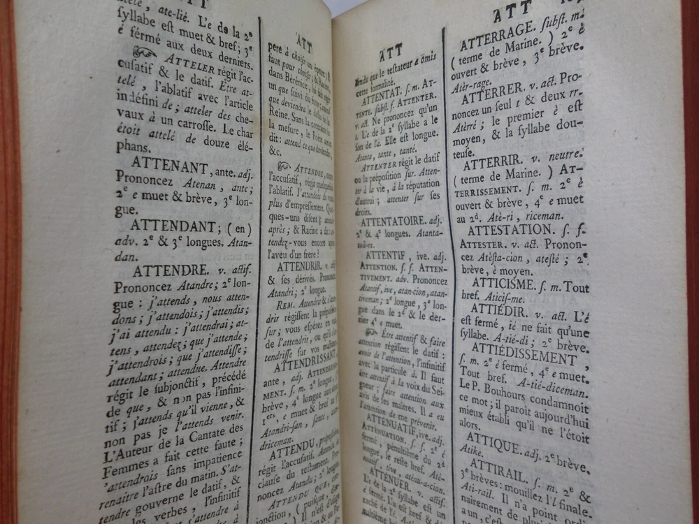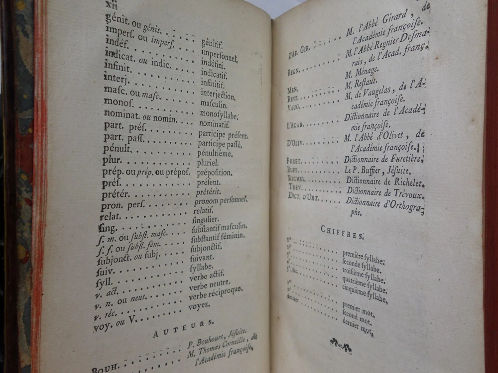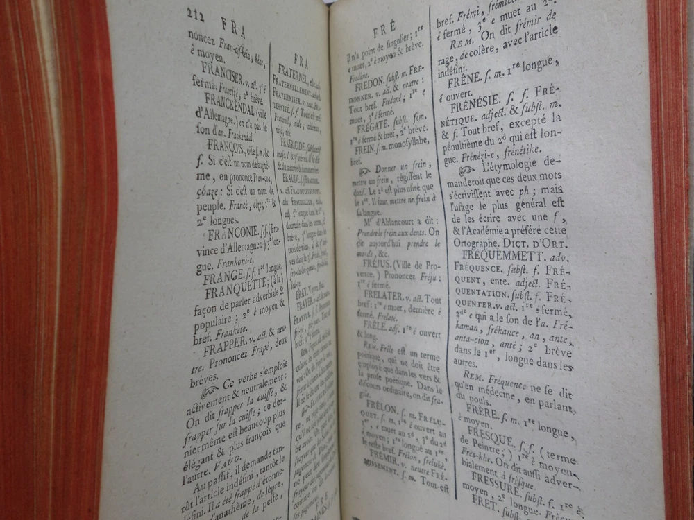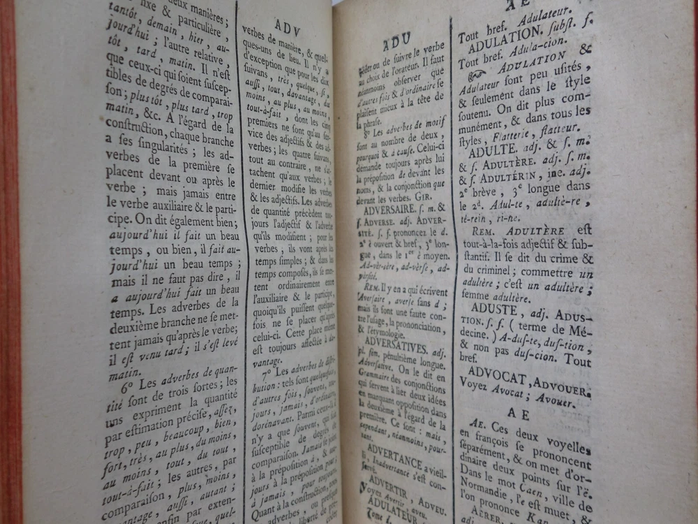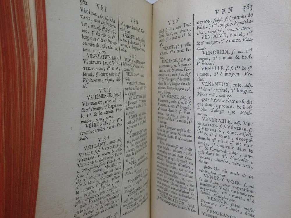 [FERAUD, Jean - François (1725 - 1807)]. Dictionnaire Grammatical de la Langue Françoise. Contenant toutes les Règles de l'Orthographe, de la Prononciation, de la Prosodie, du Régime, de la Construction, et avec les Remarques et Observations des plus habiles Grammairiens. A Paris, Chez Vincent, Imprimeur-Libraire, rue Saint Severin. M DCC LXVIII [1768]. New edition, revised, corrected and considerably enlarged. In two volumes. Leather-bound. Hardcover. Octavo (205 x 125 mm.). Pp. xiii, [3], 304 - 280; 539, [8]. French text in double columns. Bound in stunning contemporary full mottled calf. Spine gilt in six compartments. Title and volume number in gilt on contrasting lettering-pieces. Red dyed page edges. Marbled endpapers. Half-titles present. Condition: NEAR FINE. An excellent clean and tight copy with minimal wear. Without previous ownership markings. Scarce thus. International tracked shipping - dispatched promptly and securely. Please view my other books.