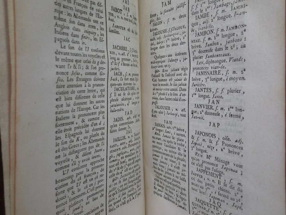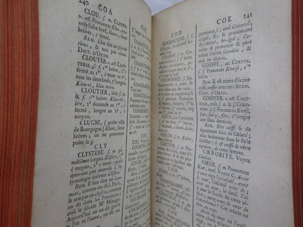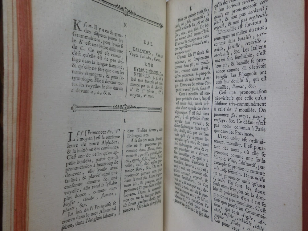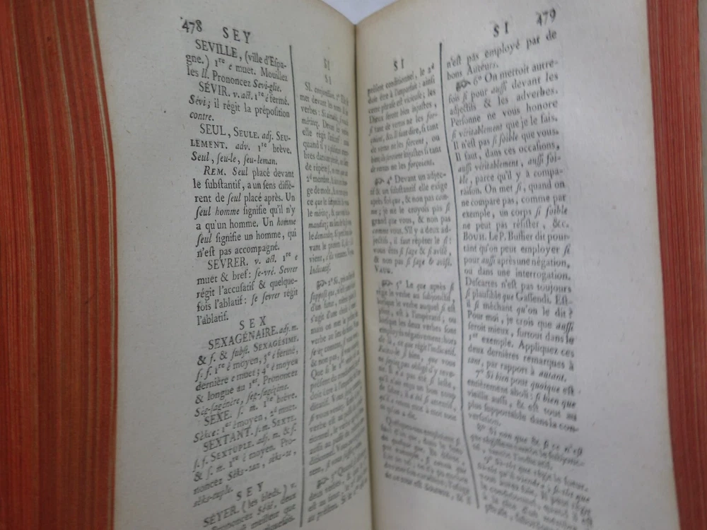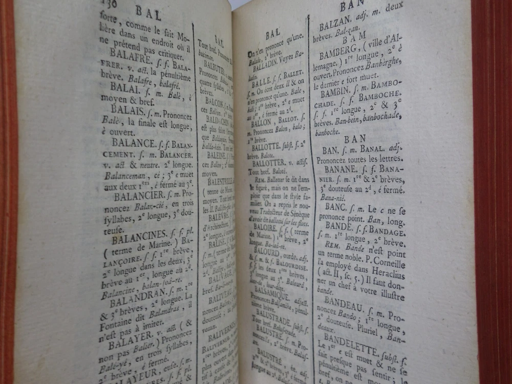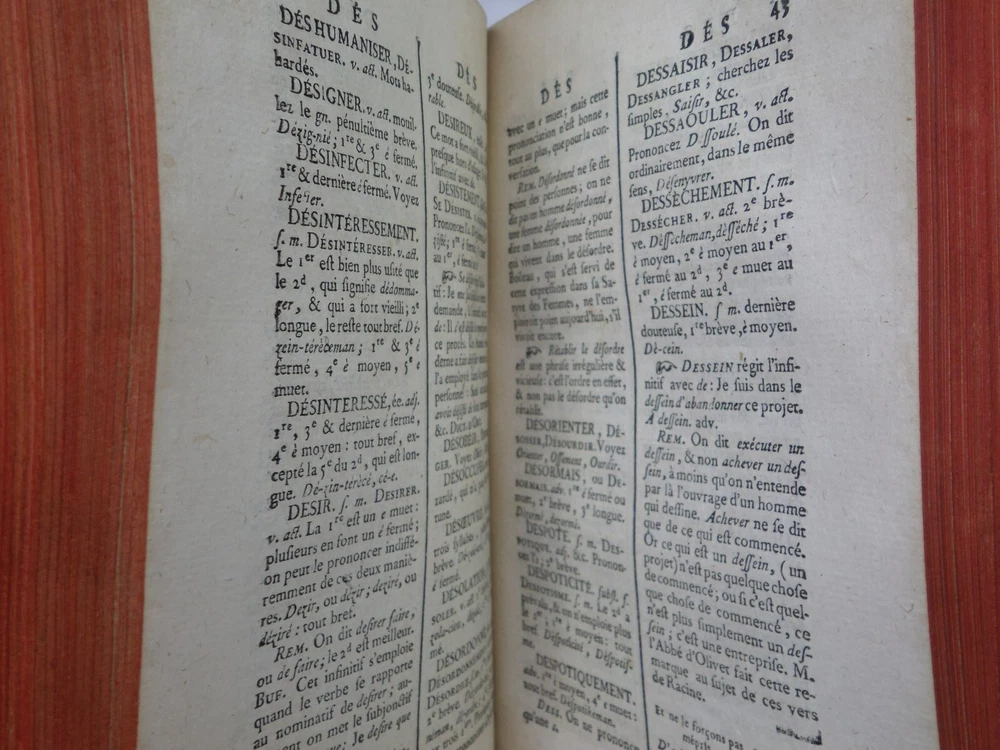 [FERAUD, Jean - François (1725 - 1807)]. Dictionnaire Grammatical de la Langue Françoise. Contenant toutes les Règles de l'Orthographe, de la Prononciation, de la Prosodie, du Régime, de la Construction, et avec les Remarques et Observations des plus habiles Grammairiens. A Paris, Chez Vincent, Imprimeur-Libraire, rue Saint Severin. M DCC LXVIII [1768]. New edition, revised, corrected and considerably enlarged. In two volumes. Leather-bound. Hardcover. Octavo (205 x 125 mm.). Pp. xiii, [3], 304 - 280; 539, [8]. French text in double columns. Bound in stunning contemporary full mottled calf. Spine gilt in six compartments. Title and volume number in gilt on contrasting lettering-pieces. Red dyed page edges. Marbled endpapers. Half-titles present. Condition: NEAR FINE. An excellent clean and tight copy with minimal wear. Without previous ownership markings. Scarce thus. International tracked shipping - dispatched promptly and securely. Please view my other books.