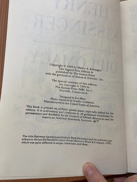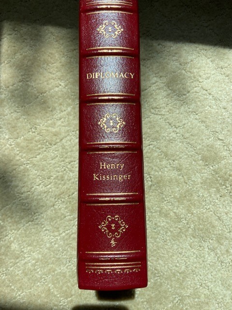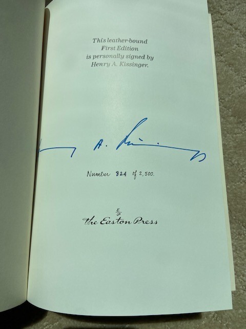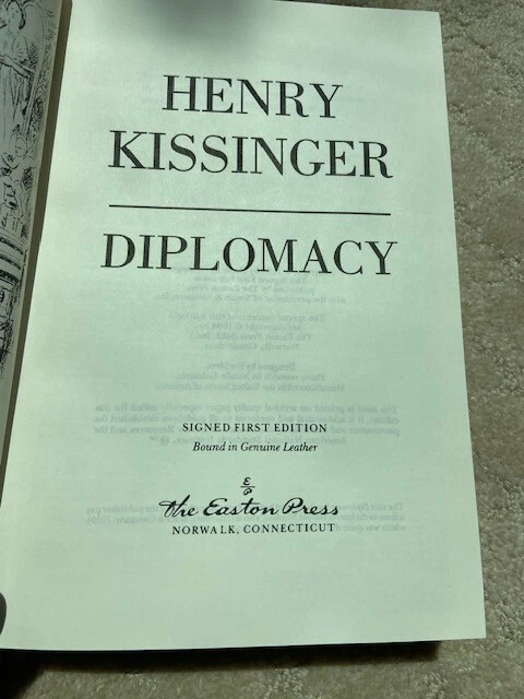This Easton Press book is signed by Henry Kissinger in 1994. It is number 824 out of 2500. From Library Journal After nearly a dozen books and service as secretary of state for presidents Nixon and Ford, Kissinger has established himself as a major thinker, writer, and actor on the world's diplomatic stage. This book is a remarkable survey of the craft of international relations from the early 17th century to the present era. Beginning with the 1648 Peace of Westphalia, Kissinger summarizes three centuries of Western diplomacy, giving special attenton to the influence of Wilsonian idealism on 20th-century American foreign policy. He is not shy about describing his own contributions to Nixon's foreign gambits, nor is he reticient about offering his own advice to the current administration on how to handle Russia, China, or the rest of the world. From Kissinger we learn that there is really little new about the New World Order. This is an important contribution to the theoretical literature on foreign affairs and will also serve quite ably as a one-volume synthesis of modern diplomatic history. All libraries should have this impressive book. - Ed Goedeken, Iowa State Univ. Lib., Ames