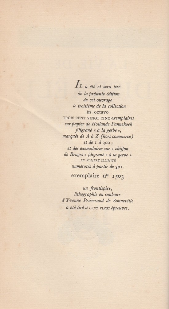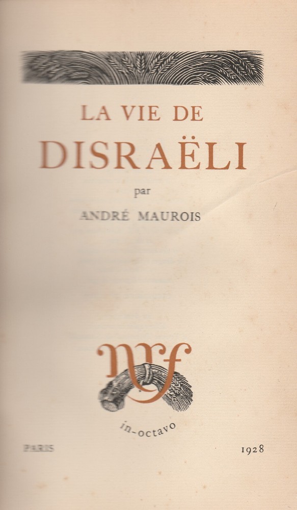 "La Vie De Disraeli" by Andre Maurois, Paris 1928, Limited Edition, this one being #1503, Published by NRF, 342 pages, Ex--Library, Bound in 1/2 Black Leather, with Marbled Boards, book approximately 6 by 9 inches, CORNERS BUMPED, GENERAL WEAR, otherwise Good Condition. See pictures. This is a biography on British Prime Minister Disraeli.