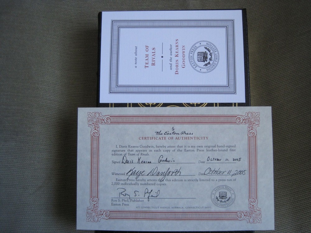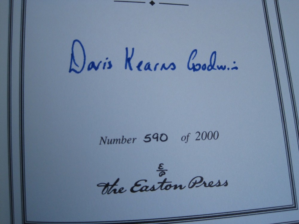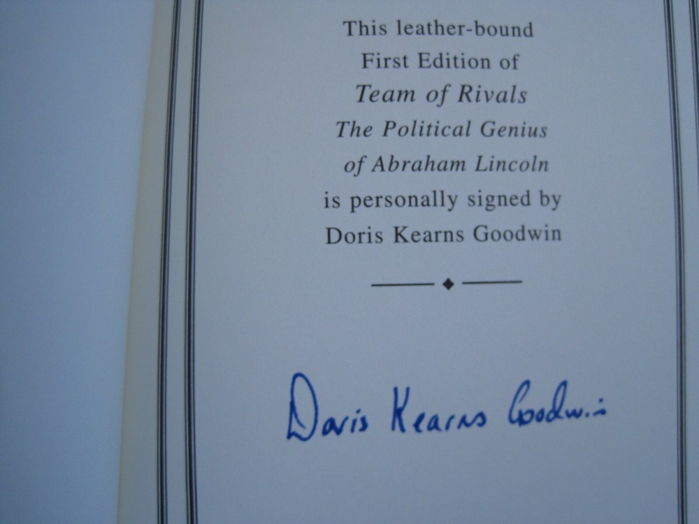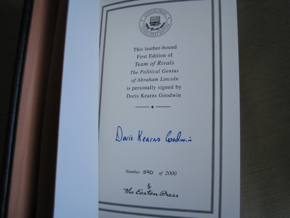 This is a leather bound signed and numbered first edition of Doris Kearns Goodwin's Pulitzer Prize winning best-seller "Team Of Rivals - The Political Genius Of Abraham Lincoln" . Acclaimed historian Doris Kearns Goodwin illuminates Lincoln's political genius in this highly original work, as the one-term congressman and prairie lawyer rises from obscurity to prevail over three gifted rivals of national reputation to become president. On May 18, 1860, William H. Seward, Salmon P. Chase, Edward Bates, and Abraham Lincoln waited in their hometowns for the results from the Republican National Convention in Chicago. When Lincoln emerged as the victor, his rivals were dismayed and angry. Throughout the turbulent 1850s, each had energetically sought the presidency as the conflict over slavery was leading inexorably to secession and civil war. That Lincoln succeeded, Goodwin demonstrates, was the result of a character that had been forged by experiences that raised him above his more privileged and accomplished rivals. He won because he possessed an extraordinary ability to put himself in the place of other men, to experience what they were feeling, to understand their motives and desires. It was this capacity that enabled Lincoln as president to bring his disgruntled opponents together, create the most unusual cabinet in history, and marshal their talents to the task of preserving the Union and winning the war. We view the long, horrifying struggle from the vantage of the White House as Lincoln copes with incompetent generals, hostile congressmen, and his raucous cabinet. He overcomes these obstacles by winning the respect of his former competitors, and in the case of Seward, finds a loyal and crucial friend to see him through. This brilliant multiple biography is centered on Lincoln's mastery of men and how it shaped the most significant presidency in the nation's history. The book is unread, and in great condition (see images). Signed by the author on the limitation page, this is book number 590 of only 2000 numbered copies ever printed of this limited first edition. The book includes the signed and dated certificate of authenticity and the publisher's note card. Easton Press books are the golden standard in the publishing industry, highly collectible and lasting generations. Easton Press Full Genuine Leather Hubbed Spine Accented Wit 22 kt. Real Gold Satin Ribbon Page Marker Distinctive Cover Design Gilded Page Edges To Protect Against Humidity High Quality Acid - Free paper Smyth-Sewn Pages Silk-Moire Endleaves I combine multiple items for savings on shipping charges. I ship worldwide. Please ask about international shipping charges and/or different shipping options.Thank you!