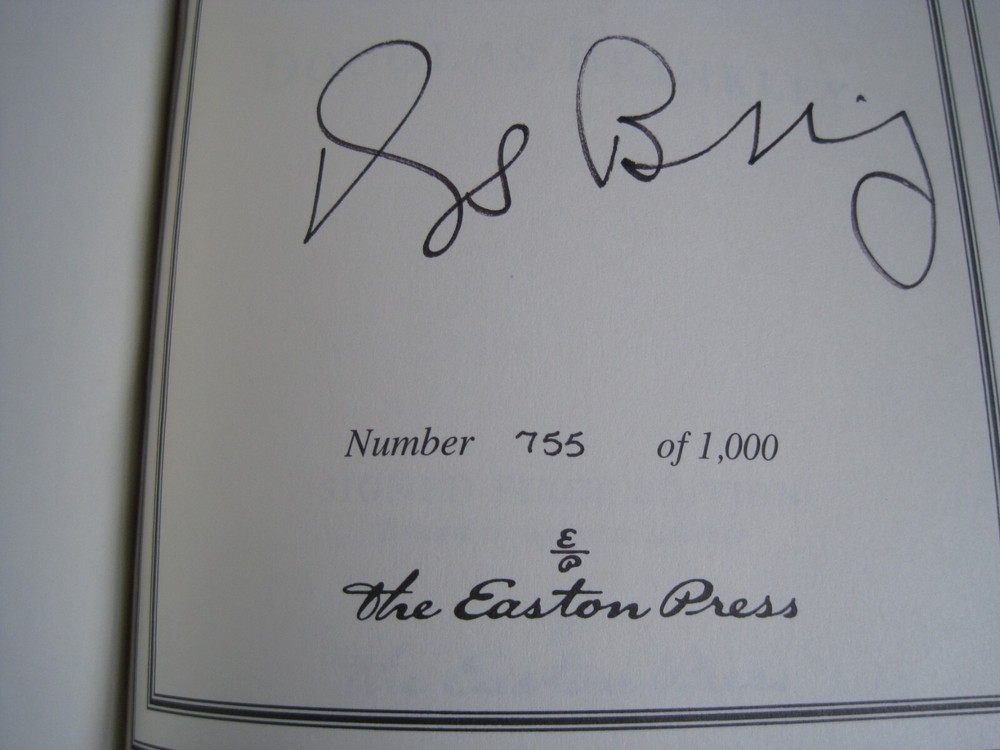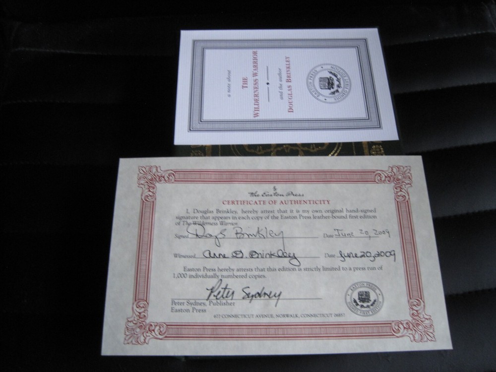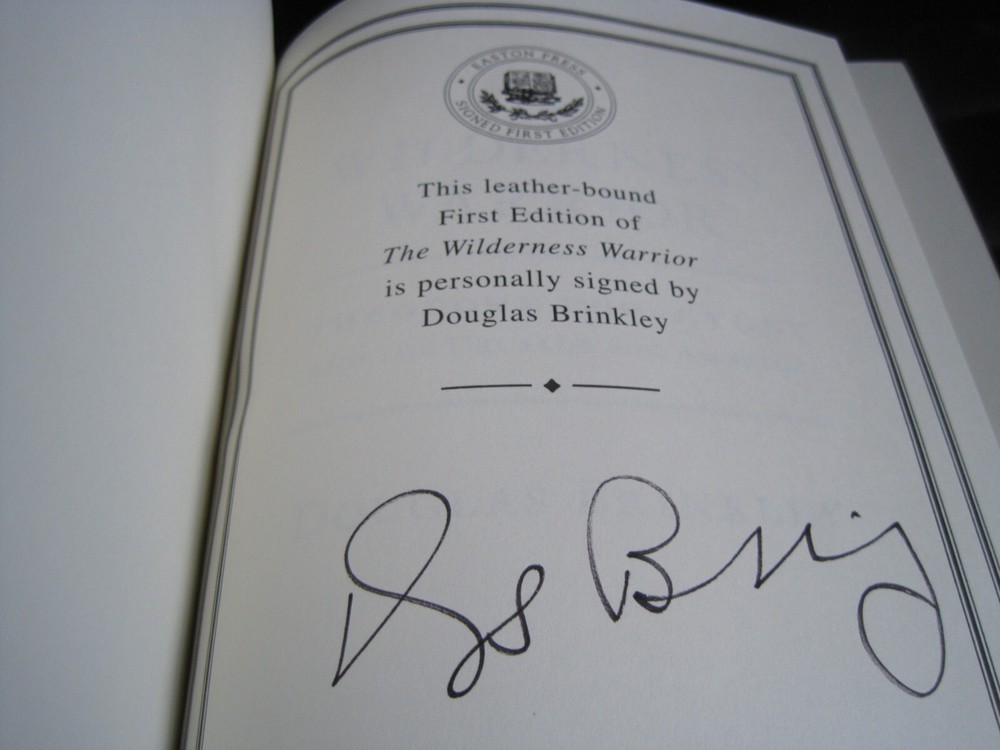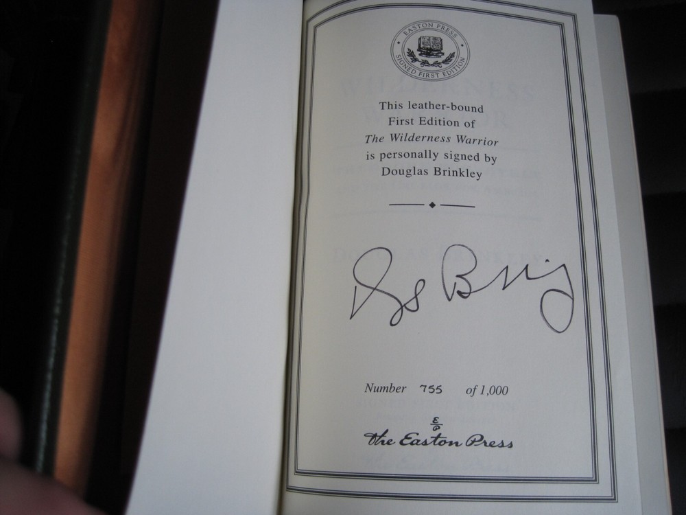 This is a leather bound signed and numbered first edition of Douglas Brinkley's award winning best-seller "The Wilderness Warrior - Theodore Roosevelt And The Crusade For America" . From New York Times bestselling historian Douglas Brinkley comes a sweeping historical narrative and eye-opening look at the pioneering environmental policies of President Theodore Roosevelt, avid bird-watcher, naturalist, and the founding father of America’s conservation movement. In this groundbreaking epic biography, Douglas Brinkley draws on never-before-published materials to examine the life and achievements of our “naturalist president.” By setting aside more than 230 million acres of wild America for posterity between 1901 and 1909, Theodore Roosevelt made conservation a universal endeavor. This crusade for the American wilderness was perhaps the greatest U.S. presidential initiative between the Civil War and World War I. Roosevelt’s most important legacies led to the creation of the U.S. Fish and Wildlife Service and passage of the Antiquities Act in 1906. His executive orders saved such treasures as Devils Tower, the Grand Canyon, and the Petrified Forest. The book is unread, and in great condition (see images). Signed by the author on the limitation page, this is book number 755 of only 1000 numbered copies ever printed of this limited first edition. The book includes the signed and dated certificate of authenticity and the publisher's note card. Easton Press books are the golden standard in the publishing industry, highly collectible and lasting generations. Easton Press Full Genuine Leather Hubbed Spine Accented Wit 22 kt. Real Gold Satin Ribbon Page Marker Distinctive Cover Design Gilded Page Edges To Protect Against Humidity High Quality Acid - Free paper Smyth-Sewn Pages Silk-Moire Endleaves I combine multiple items for savings on shipping charges. I ship worldwide. Please ask about international shipping charges and/or different shipping options. Thank you!