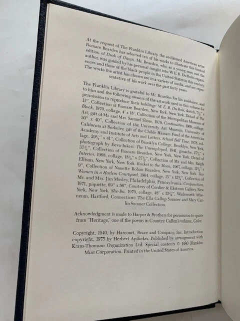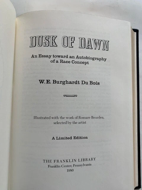 W.E.B. Du Bois. (Text) Romare Bearden. (Illustrations) "DUSK OF DAWN. AN ESSAY TOWARD AN AUTOBIOGRAPHY OF A RACE CONCEPT." Franklin Library. Franklin Center (1980) First limited edition. Fine in black leather binding with gilt edges and stamping, without dust jacket as issued. (355pp.) Illustrated by Romare Bearden.
