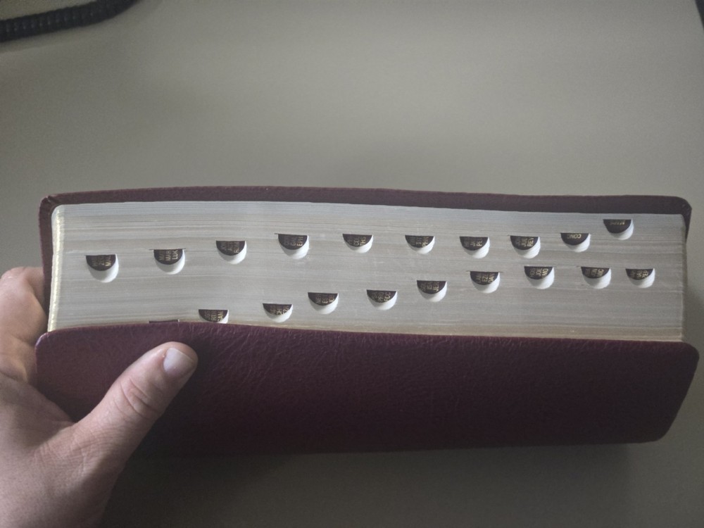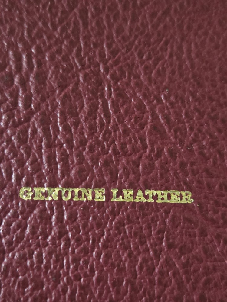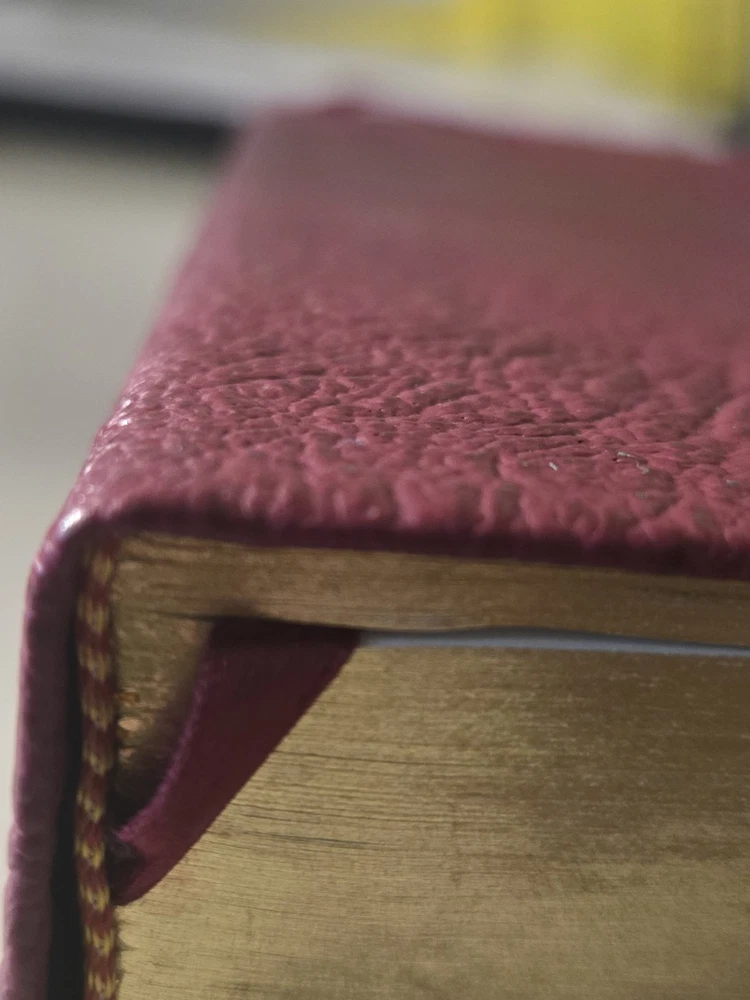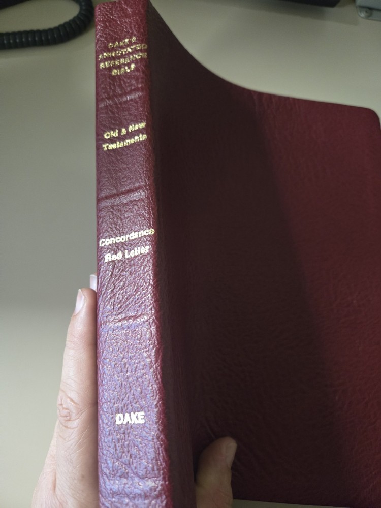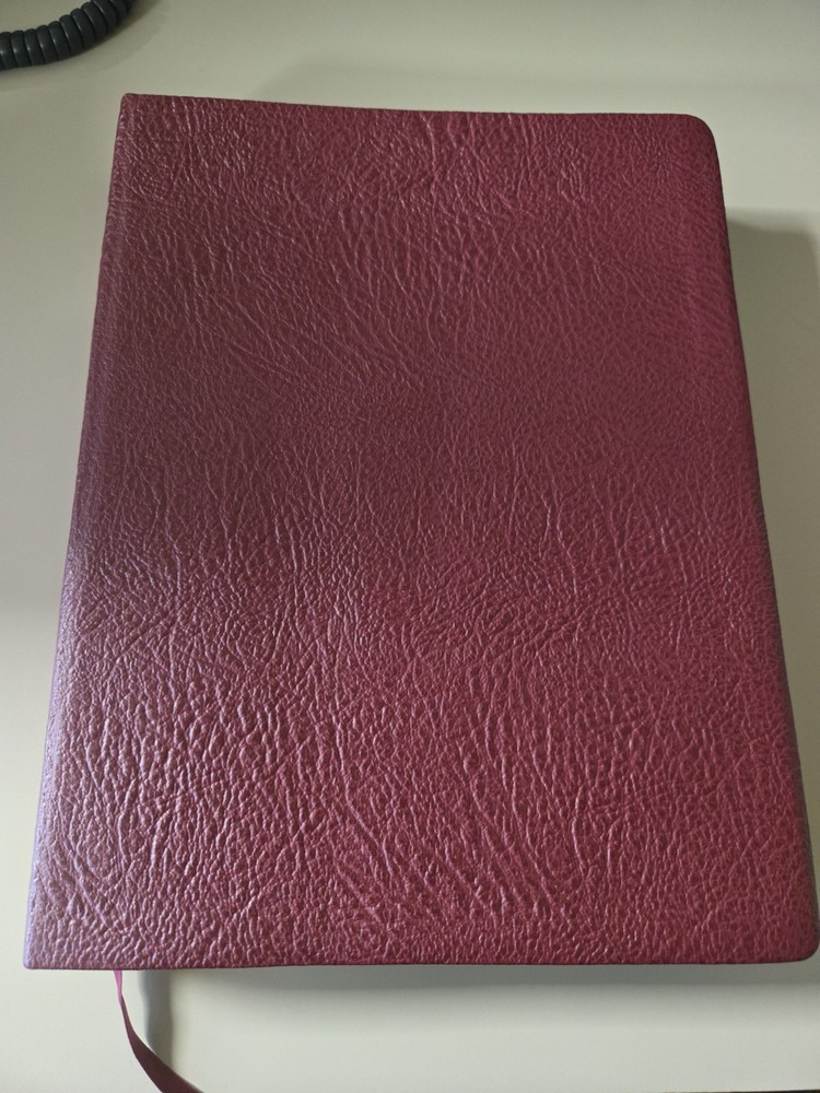 I've only found one area with pen mark, I've included a picture. Some slight crinkles but no rips, tears, or scuffs. Genuine Leather binding with rich unique natural hide patterns. This is more like a desk reference due to its larger width and length. Very good beautiful Bible.