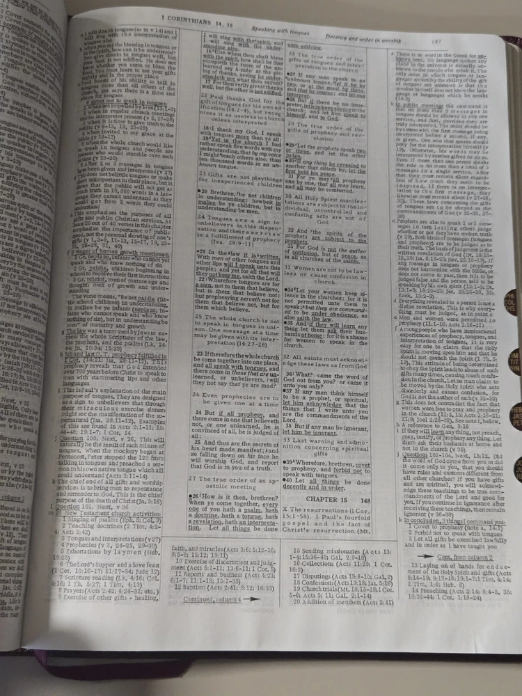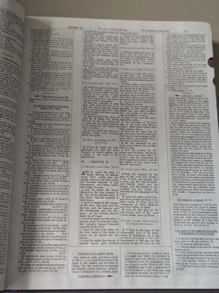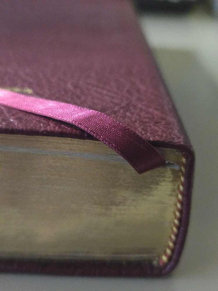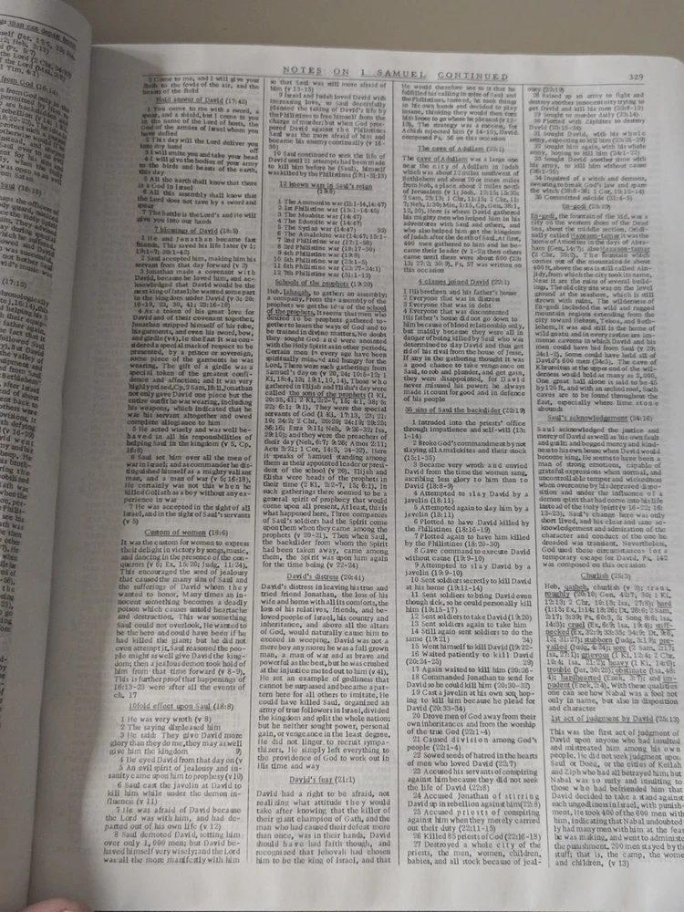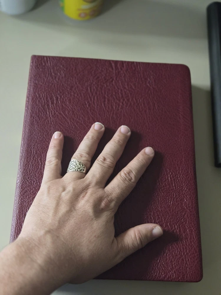 I've only found one area with pen mark, I've included a picture. Some slight crinkles but no rips, tears, or scuffs. Genuine Leather binding with rich unique natural hide patterns. This is more like a desk reference due to its larger width and length. Very good beautiful Bible.