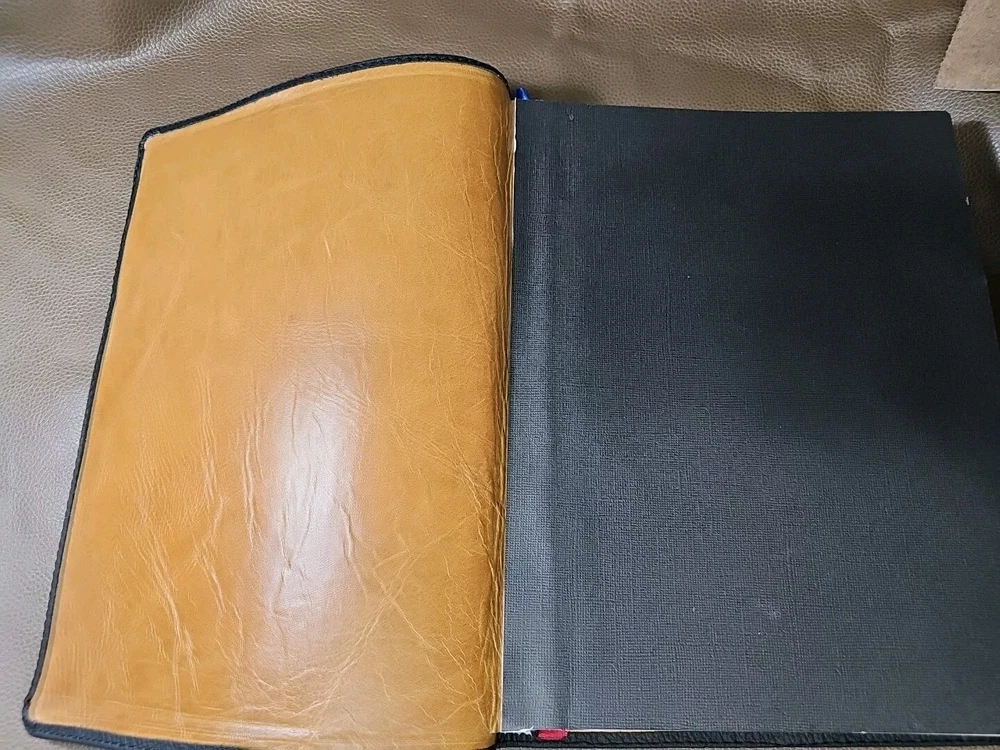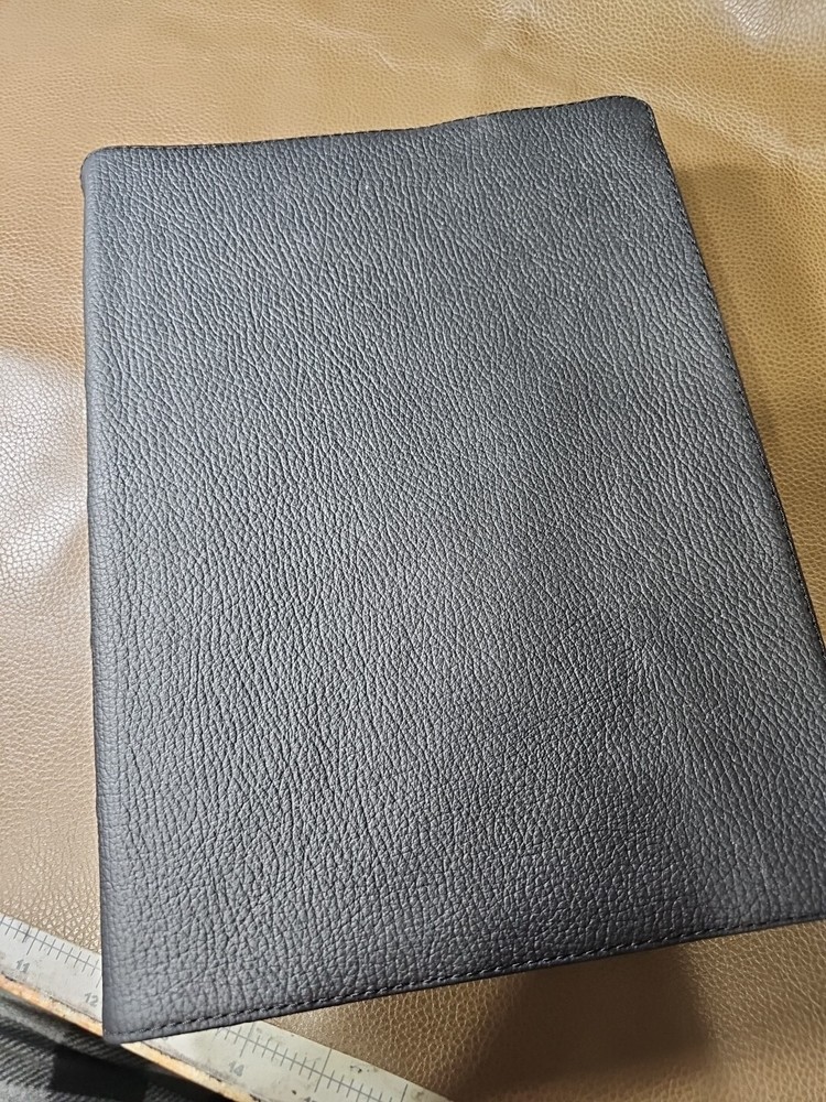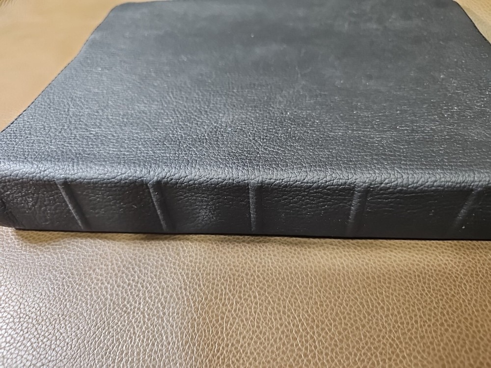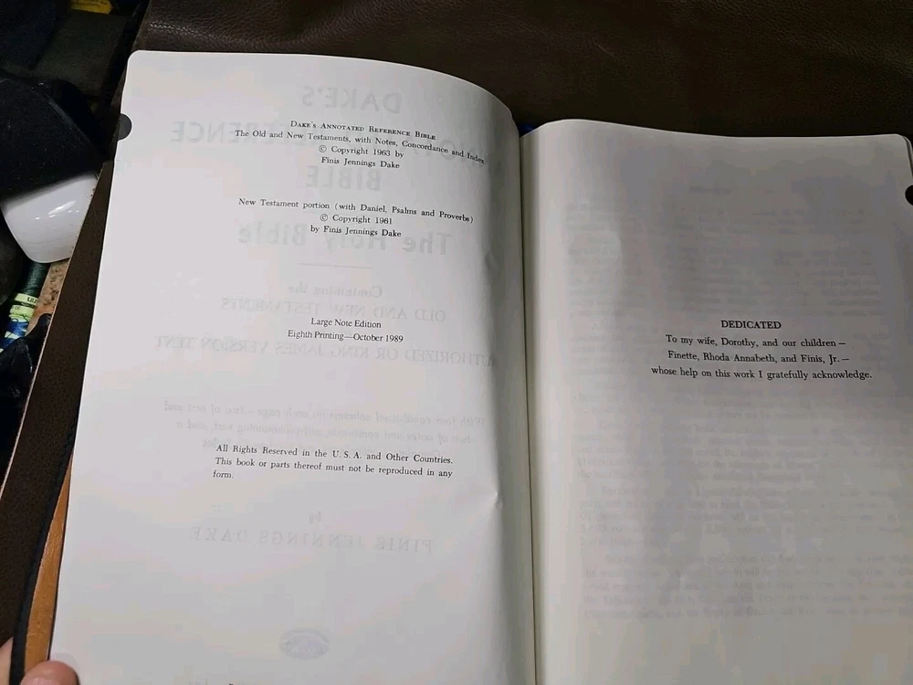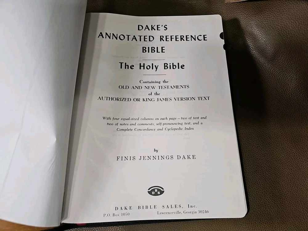Up for your consideration is the rebind Dake's Annotated Reference Bible. Goatskin rebind cover with cowhide leather Liner. KJV Bible. Five raised ribs and three ribbons were added to this beautiful bible. As I state in all my listings, I am not a professional in rebounding books. I have acquired the hobby and enjoy doing it. Please look at all the photos for they, too, are part of the description. This is not a red-letter edition. Please read all my feedback regarding all the bibles I have sold. Stay blessed and humble.