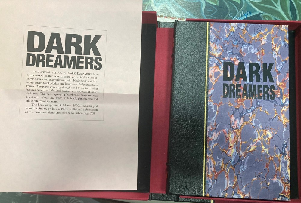 Title: Dark Dreamers: Conversations with the Masters of Horror Author: Stanley Wiater Publisher: Underwood-Miller, CA Date: 1990 Edition: First Edition, First Printing Deluxe Signed Limited Edition #134/ 350 copies signed by 26 contributors. Only copies 1 to 297 were signed by 26 Contributors with two signed limitation pages. The book is not signed by Anne Rice or Robert Bloch. Size: 8vo Pages: 206+ A who's who of modern horror: Stephen King, Clive Barker, Robert Bloch, Gary Brandner, Ramsey Campbell, Les Daniels, Dennis Etchison, John Farris, Charles Grant, James Herbert, Peter Straub, Dean Koontz, Joe Lansdale, Richard Laymon, Graham Masterton, Richard Matheson, Robert McCammon, David Morrell, Anne Rice, John Saul, Skipp and Spector, Whitley Strieber, Chet Williamson, J.N. Williamson, Gahan Wilson. Condition: A fine copy with leather spine and marbled boards and endpapers in a fine traycase as shown. A beautiful, as new copy. See Photos 869748/LRBC1