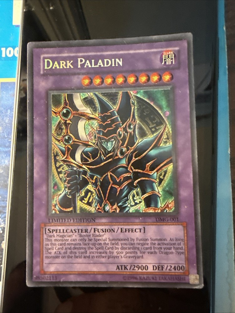 Elevate your Yu-Gi-Oh! TCG collection with the Dark Paladin DMG-001, a must-have for duelists and collectors alike. As a Secret Rare card from the Duel Master's Guide set, it features the formidable Dark Paladin, a Spellcaster with an attack power of 2900 and a defense toughness of 2400. This Effect and Fusion type card is a strategic asset in battle, showcasing the artistry and gameplay depth that Yu-Gi-Oh! is known for. The Dark Paladin is not only a powerful addition to your deck but also a treasured piece for its limited edition status. Published by Konami and professionally graded to a commendable score of 9, this card is a testament to its quality and care. Presented in English and bearing the card number DMG-001, it's a standout card that embodies the spirit of the game.