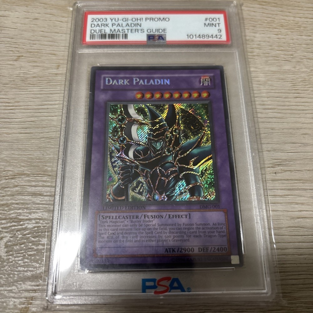 The "Dark Paladin" card is a Secret Rare Limited Edition card from the Duel Master's Guide set in the Yu-Gi-Oh! TCG. This powerful Spellcaster monster has 2900 Attack and 2400 Defense, making it a formidable card in gameplay. It is a Fusion Effect monster with a Dark attribute, and its card number is DMG-001. Created by Konami, this English-language card is highly sought after by collectors and players alike for its rarity and strategic value in the game.