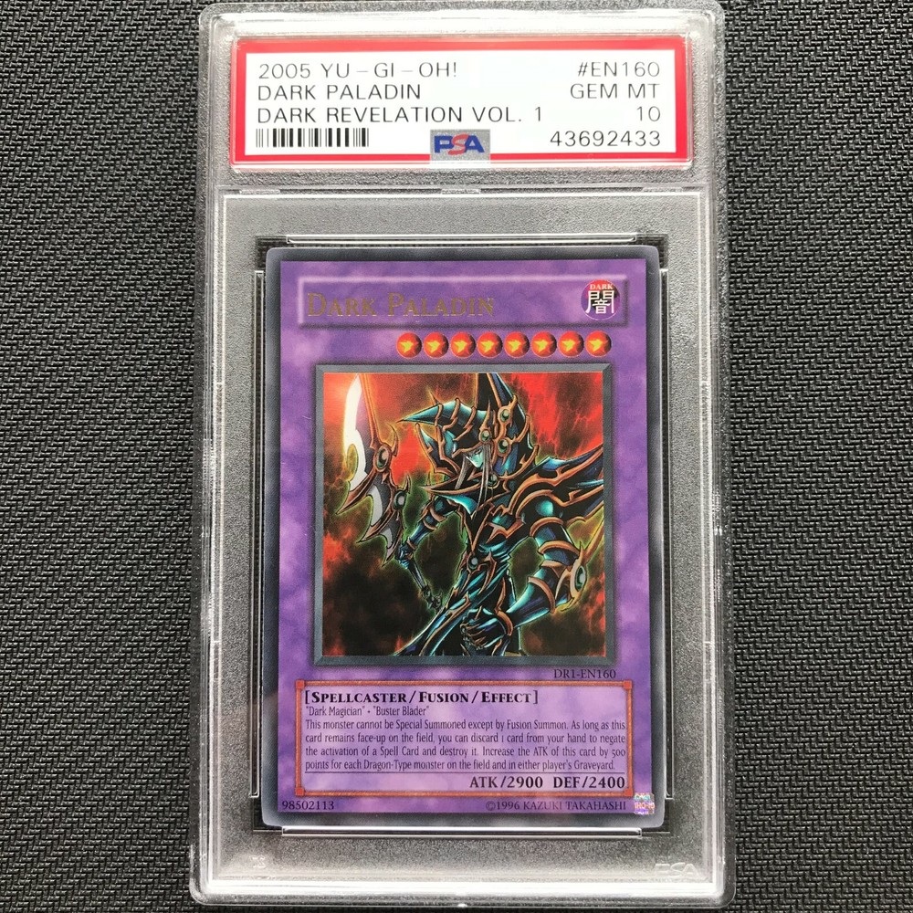 YuGiOh! Trading Card Game You will receive the exact item in the photo, please study carefully before purchase. ** Old school print 2005 DR1 - Dark Paladin - POP 4 in the World!!** Recently graded in brand new condition PSA case. Graded by the world's leading authentication service, PSA. Product Description Available with the release of Dark Revelation Volume 1 in 2005. Konami. Deckki-TCG Established in 2010, Deckki is a supplier of YuGiOh! and Pokemon Trading Cards, and Trading Card Accessories. Trusted seller with over 5000 reviews, selling collectibles for over 10 years, buy with confidence. Based in the United Kingdom and ships worldwide. Postage FREE 1st Class Signed Delivery in the UK. Same-day dispatch aim. Worldwide shipping available. Returns 30 day returns for faulty/incorrect orders. Returns only accepted in original condition.